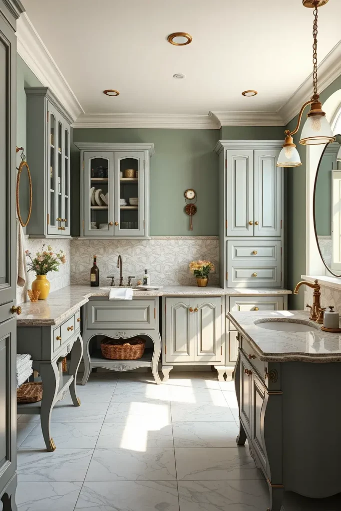 The furniture I usually buy is usually very soft and muted, distressed wood, or antique knobs with modern storage inserts and hardwearing finishes. This combination makes the cabinetry not appear old-fashioned. I seek the presence of balanced forms: a classic profile of a cabinet with a smooth stone top, e.g., or a vintage-like vanity and modern lighting. These blends make such a special warm and yet polished effect.