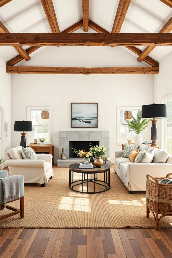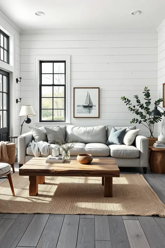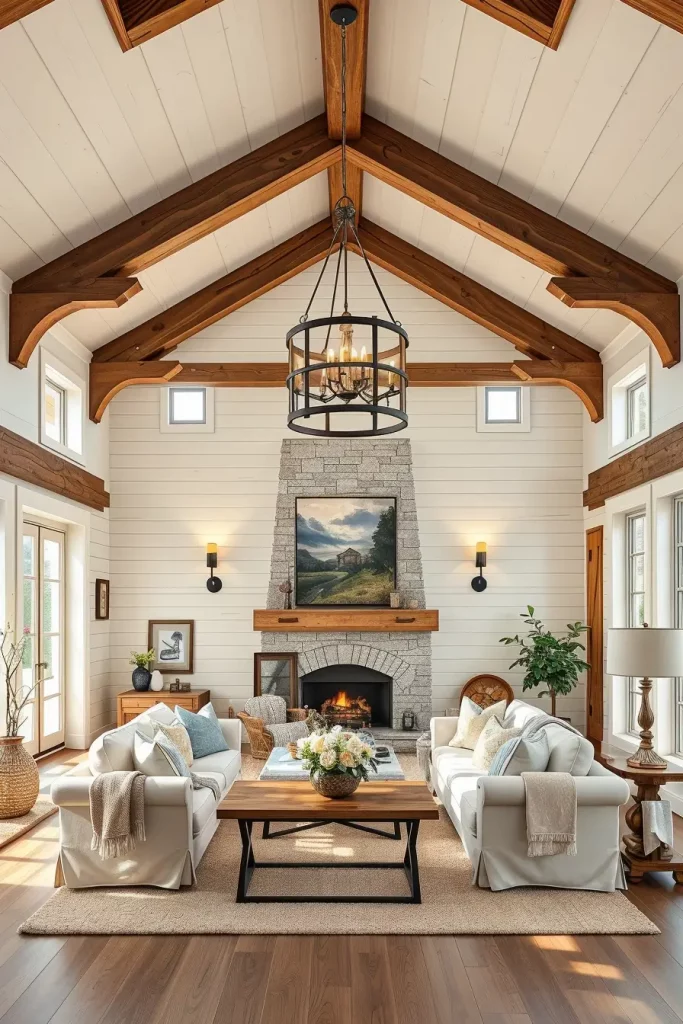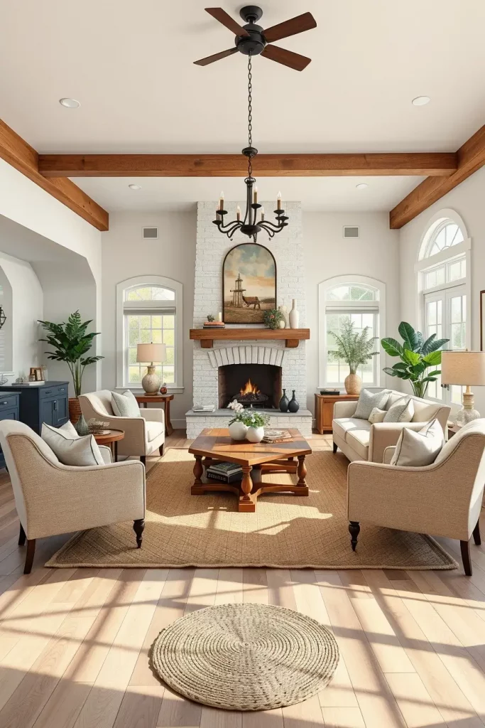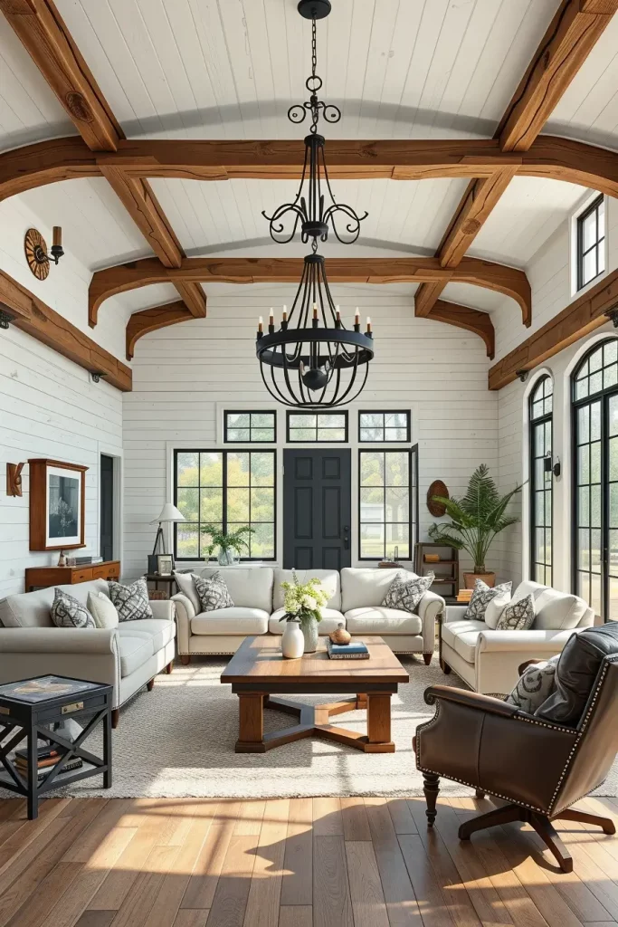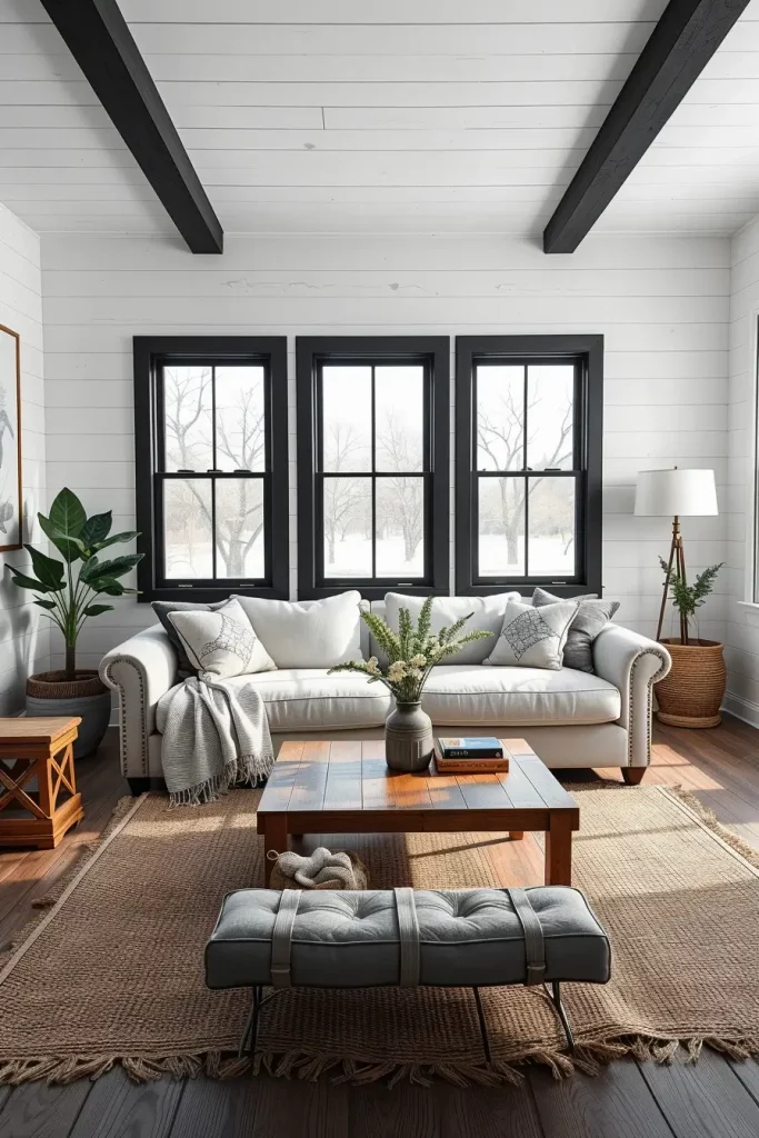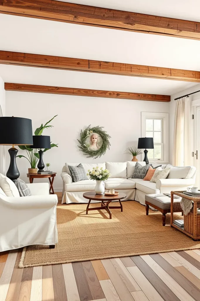 Understated harmony is achieved by the combination of cream slipcovered sofas, old-wood coffee tables and woven jute carpeting. Ceramic vases, textured throws or matte black accent lamps can be added to add a modern twist. I tend to have brushed metal finishes which reflect light in a gentle manner and help the room look classy without being overbearing of the farmhouse look.