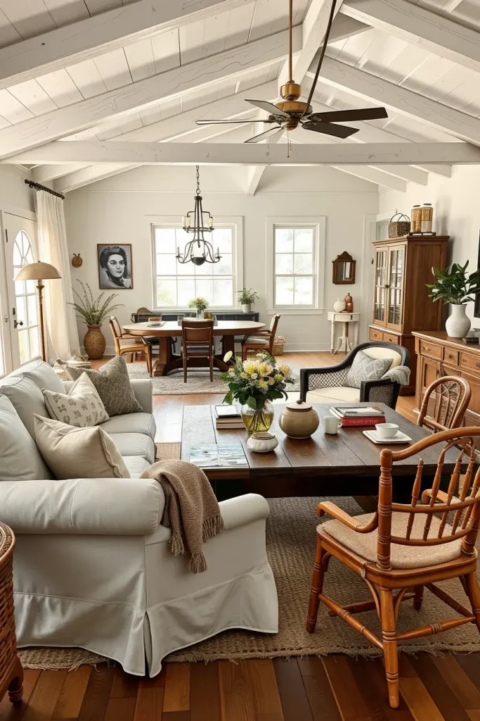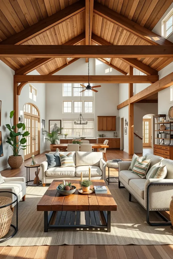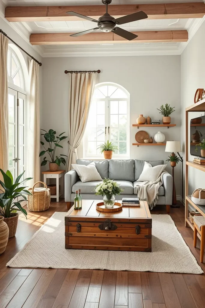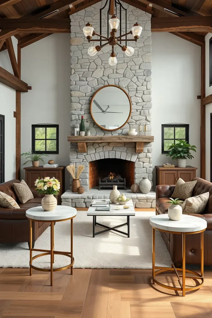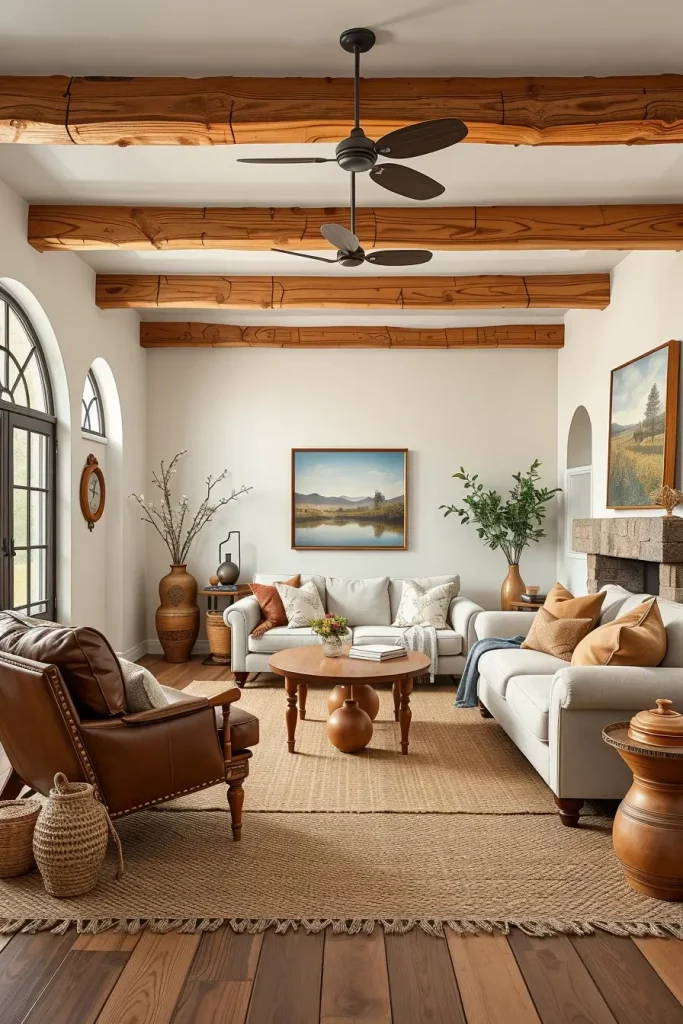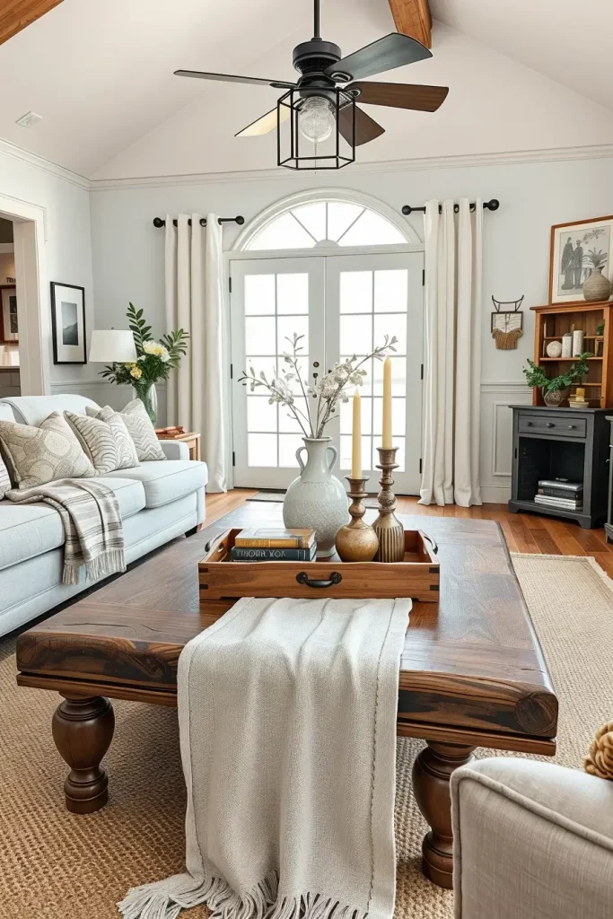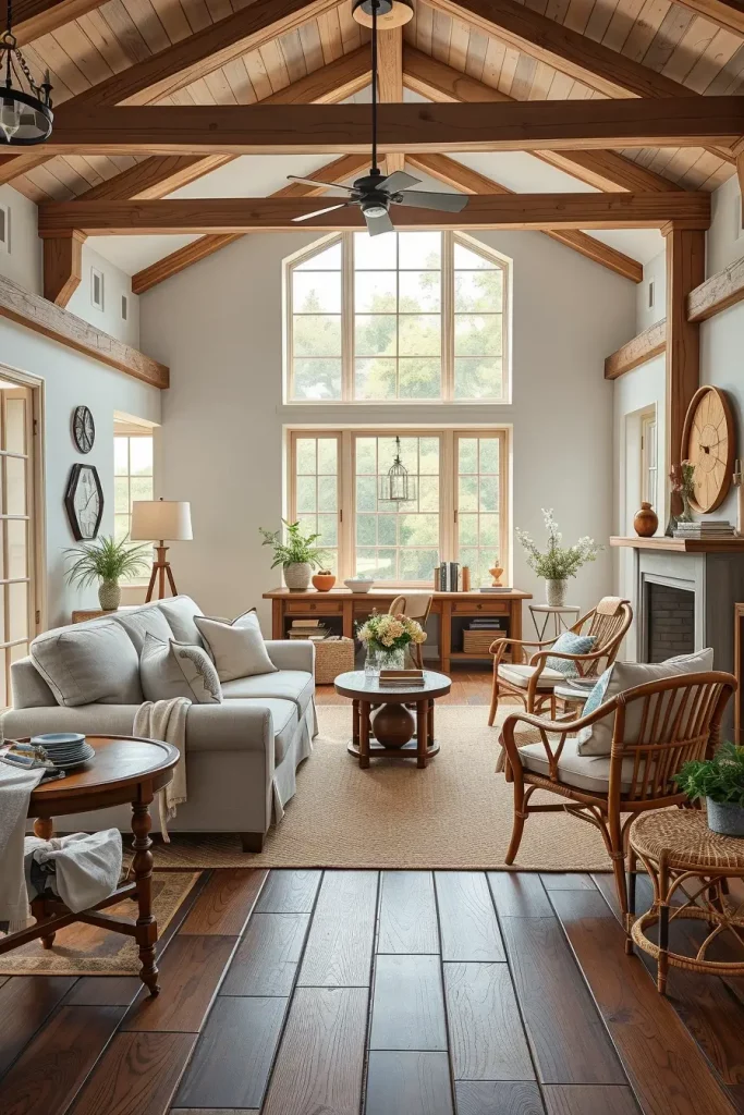 Understated harmony is achieved by the combination of cream slipcovered sofas, old-wood coffee tables and woven jute carpeting. Ceramic vases, textured throws or matte black accent lamps can be added to add a modern twist. I tend to have brushed metal finishes which reflect light in a gentle manner and help the room look classy without being overbearing of the farmhouse look.
