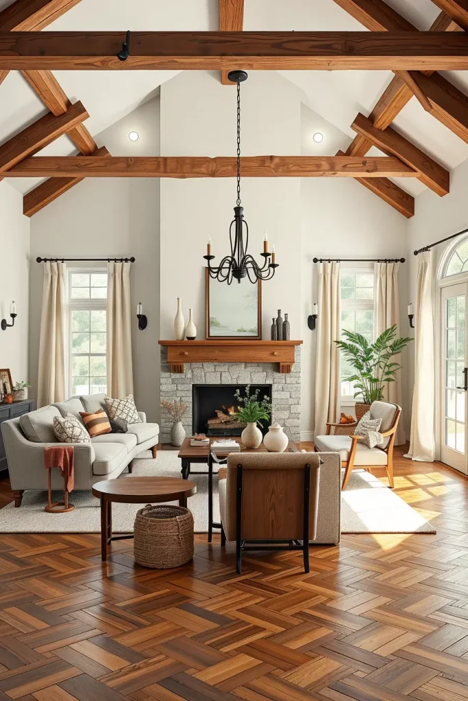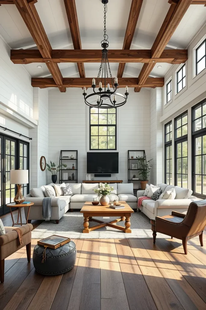 Lighting is also important in developing a welcoming farmhouse living room. In the case of 2026, I observe that there is a high level of focus on the integration between rustic and modern technology. Imaginative empty-beam ceilings combined with intelligent dimmable lights or iron chandeliers replaced with smooth LED lighting. The outcome is both nostalgia and utility, which is perfect in houses that do not want to lose functionality in favor of innovativeness.