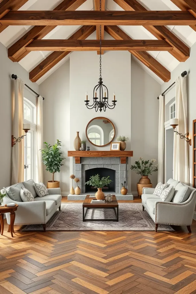 In my designing using wooden materials, I complement them with light finishes such as plaster walls, linen drapery, or new stone fire places. The features of the space that make it seem perennial without appearing dated are oak mantels, herringbone wood flooring, and rustic shelves. Together with iron sconces or pendant lighting they are the ideal rustic-modern atmosphere.