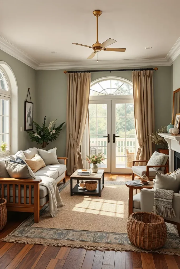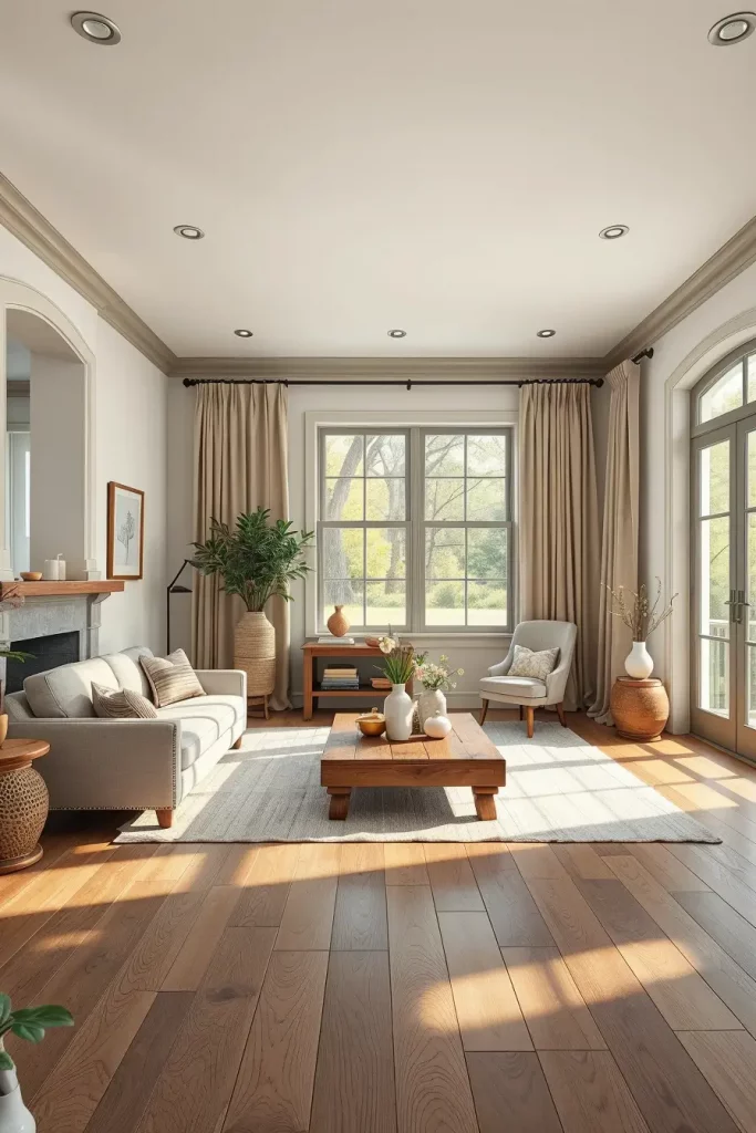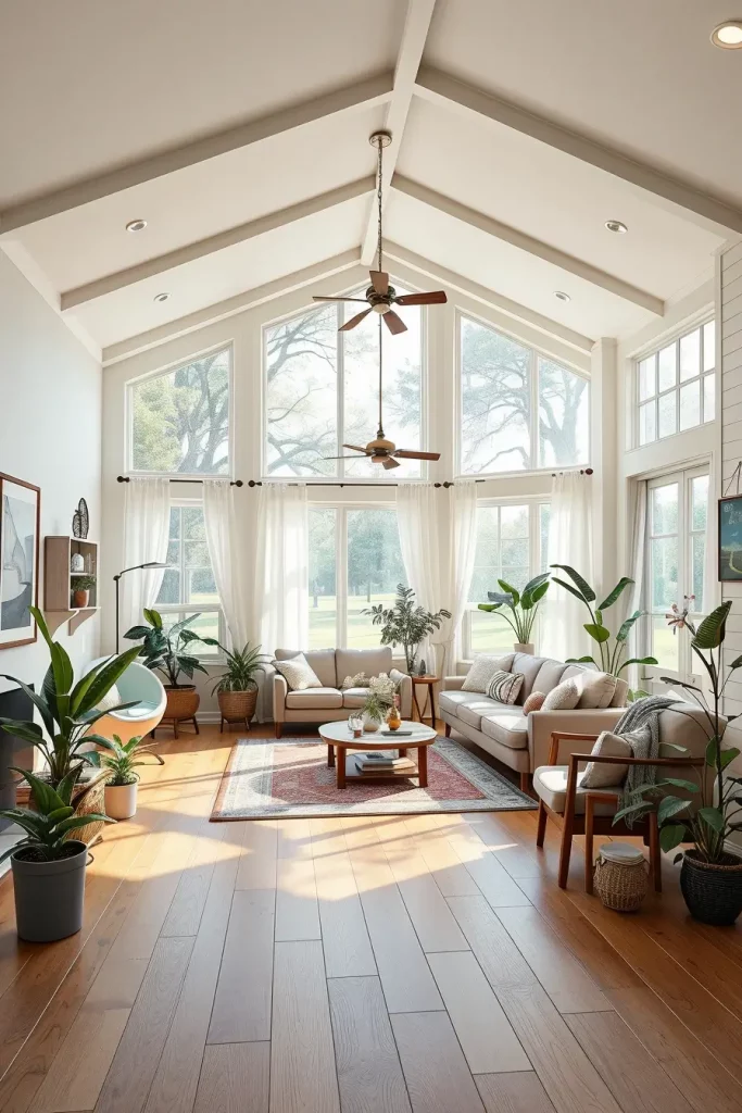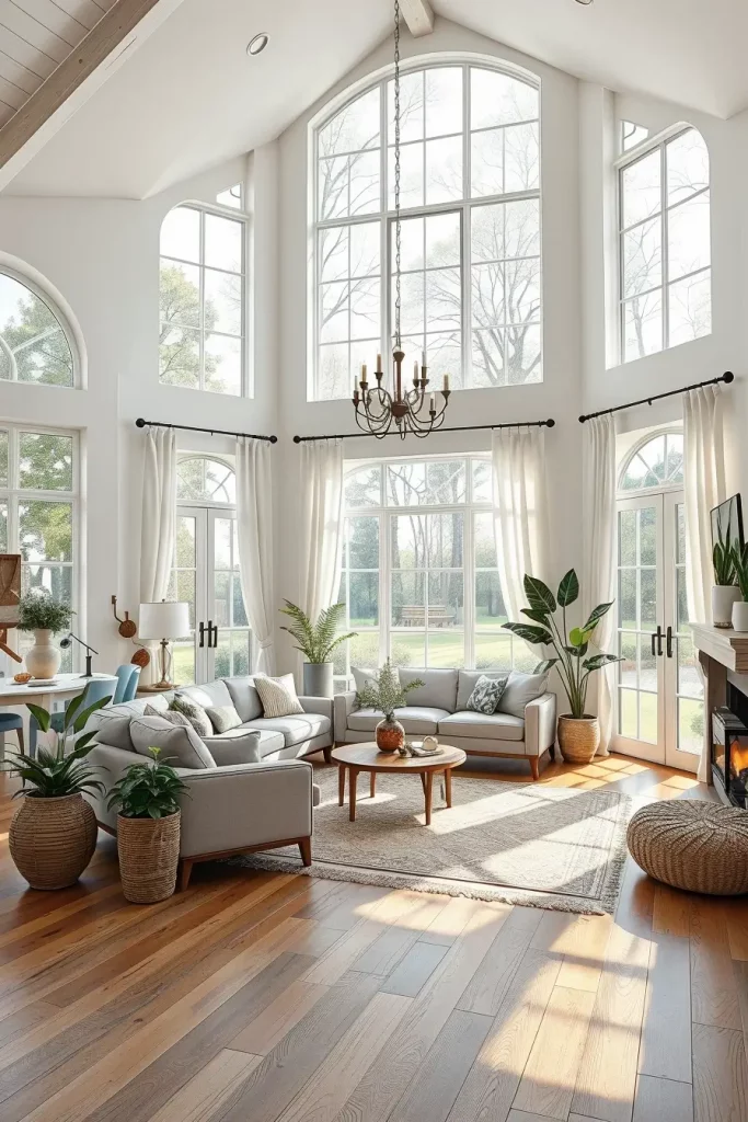 To strike the appropriate mood, I employ light-reflecting surfaces, i.e., white oak floors, sheer curtains, and neutral furniture. The sunlight is spread well in the space with the help of glass pendant lights and reflective ornaments. Plants or natural resources such as jute rugs and linen upholstery would add the sense of connection to the natural world, which is the key to the farmhouse design of a living room.