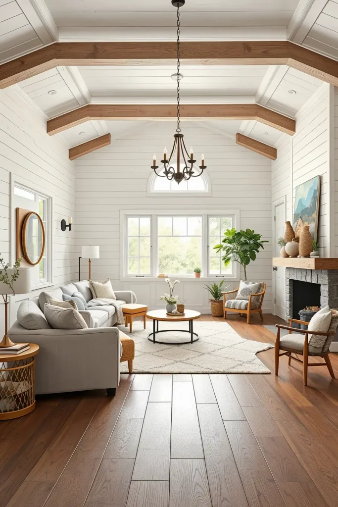 My favourite combination is white shiplap and warm oak floors and modern lighting fixtures. Half of the wall is wainscoted to provide the visual height and the sophistication. These details are effective in contemporary as well as in the traditional farmhouse living room that puts the space to ground and other decors shine. The workmanship is genuine, and not too decorative.
