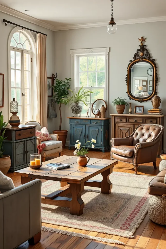 An appropriate farmhouse decor is one with a historical connotation. The trend in 2026 will be to incorporate heirloom-style furniture and antique finishing with new finishes. I frequently suggest the use of reclaimed wood coffee tables, old leather armchairs, or worn out console tables that add the flavor and realness to the room. These facts render the living room to appear like a collection room instead of a staged one.