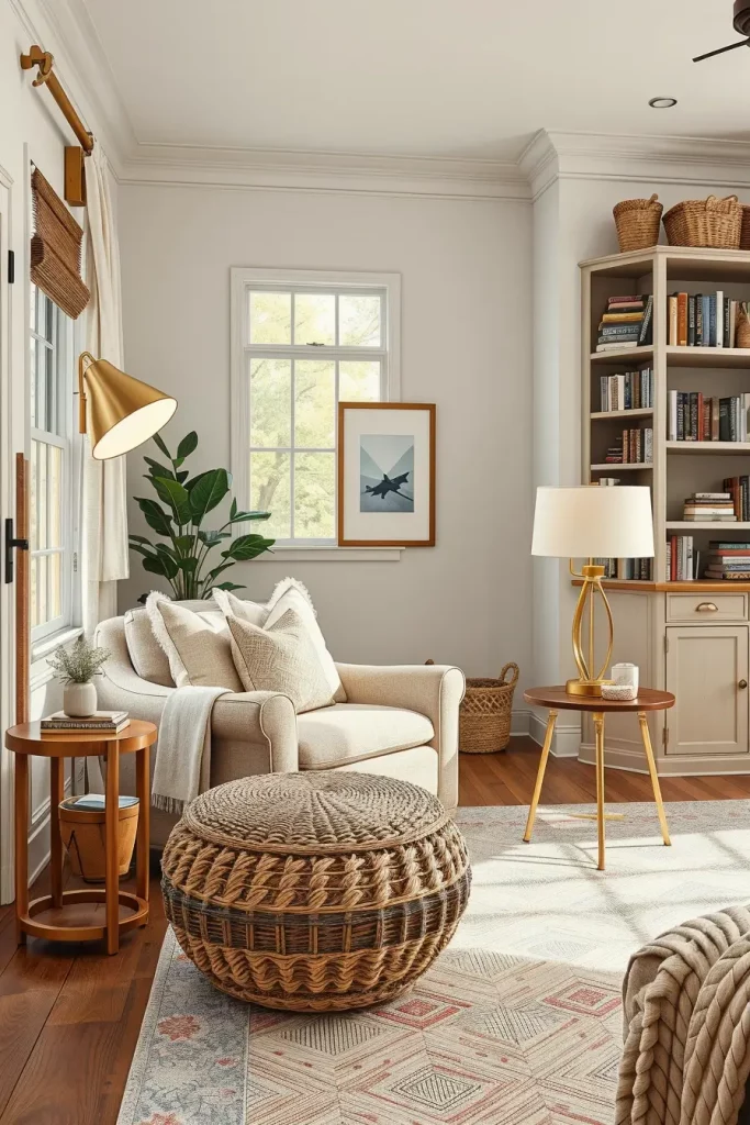 Any farmhouse living room entitles to a cozy corner to rest. Reading corners are now returning in 2026 as families are demanding digital-free places of relaxation. I prefer to furnish these areas with plush armchairs, woven poufts or a window bench, covered with textured pillows. The warm light, such as a brass floor-lamp, rounds off the calm environment.