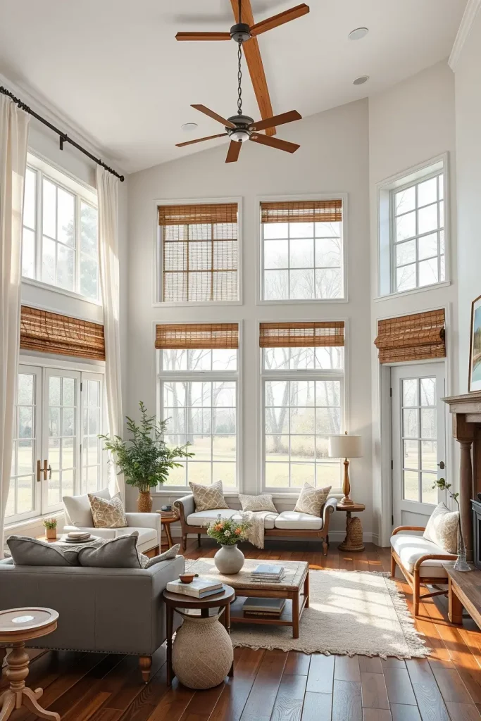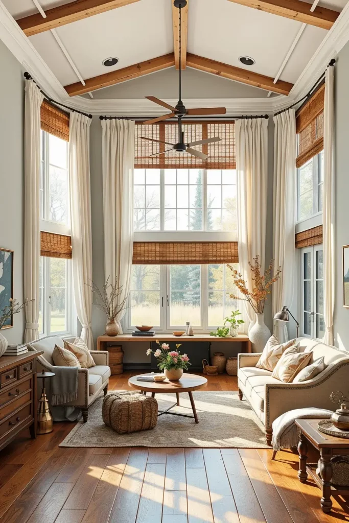 I tend to suggest the combination of sheer curtains and bamboo shades or woven blinds. This stratification is useful to offer privacy and control over light, as well as be aesthetically interesting. Hardware must not be flashy– consider black iron rods, or wooden dowels that do not stick out as such but join the farmhouse decor theme.