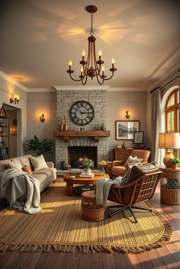 To add texture, I will suggest putting up fabrics such as jute, wool, and leather. The sitting space is held by a vast woven carpet and the softness is touchable with large knit throws and linen cushions. Wood is still the primary element of the farmhouse style, but replacing some parts with rattan or stone can add to the organic feel. The room is rich and realistic due to contrast between smooth and rough surfaces.