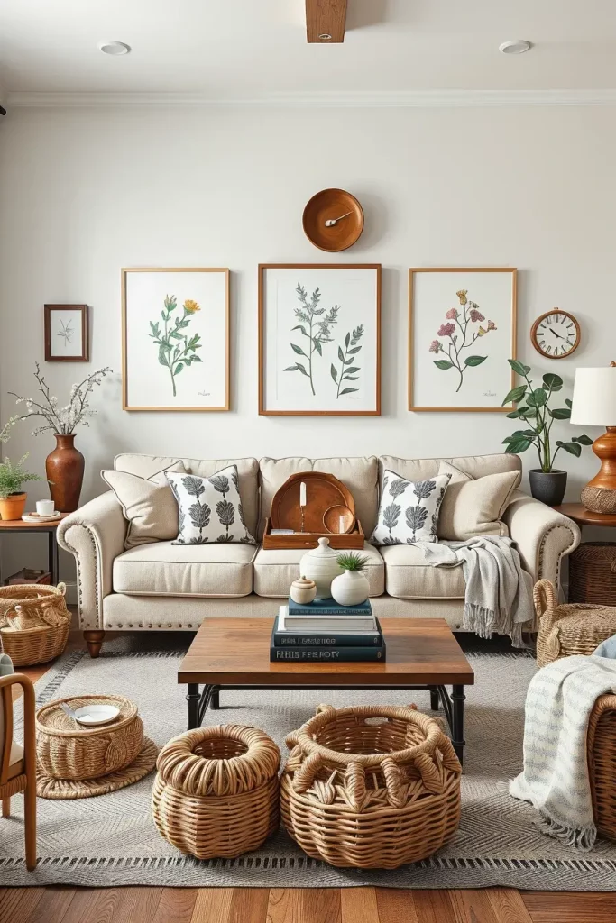 I also enjoy arranging coffee tables in rows of books, small potted plants and candles. A muted earth-colored soft area carpet unites it all, and basket storage fridges prevent clutter in view. The farmhouse decor narrative is topped off by natural elements, such as dried flowers and trays made of reclaimed-wood. In case you like to have fun, you can introduce a bar cart or an old sideboard that can also be used as a serving table.