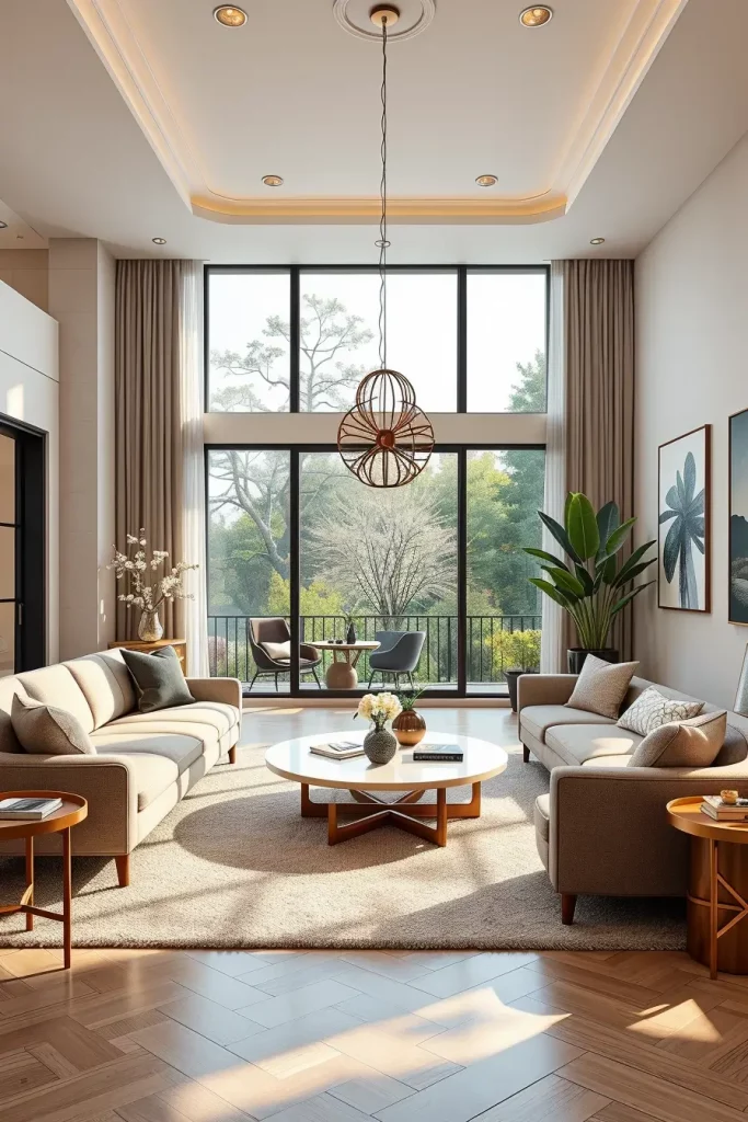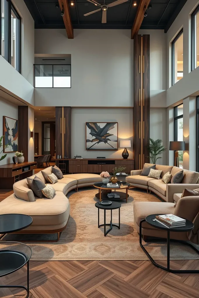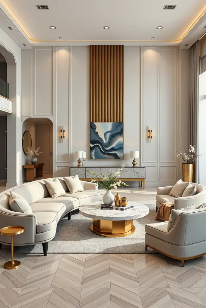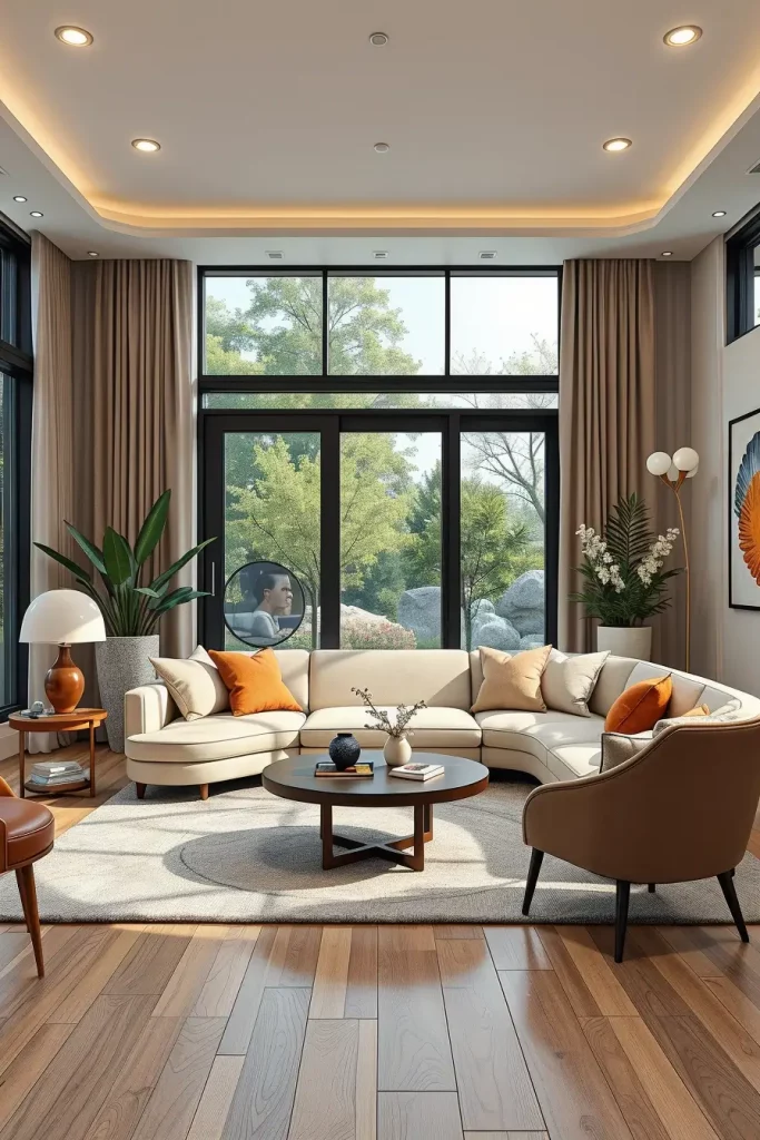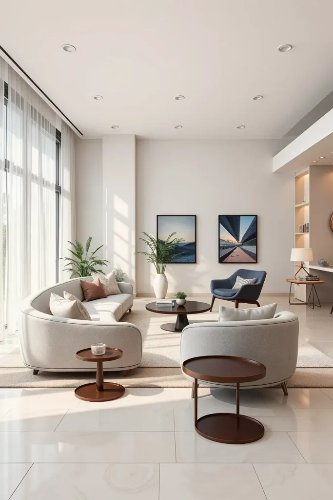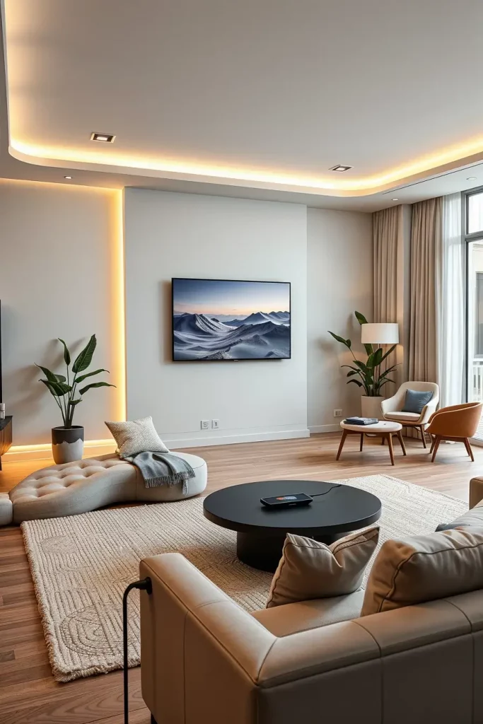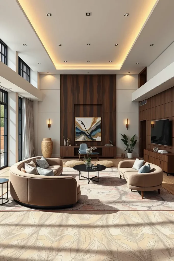 In furniture choice, I will opt to have oval coffee tables, curved sectional and modular seating that can be adjusted to suit various social contexts. Combining these with intelligent light systems and natural materials such as wood and linen contributes to the coziness and does not lose the modern style. All compositions must lead to harmony and balance.