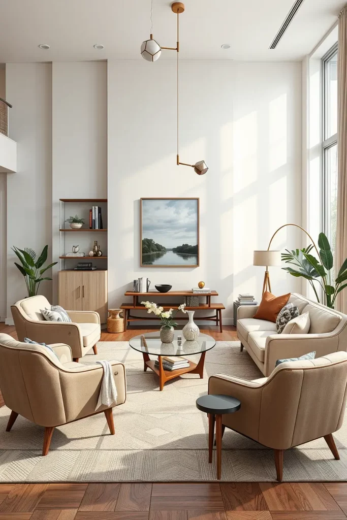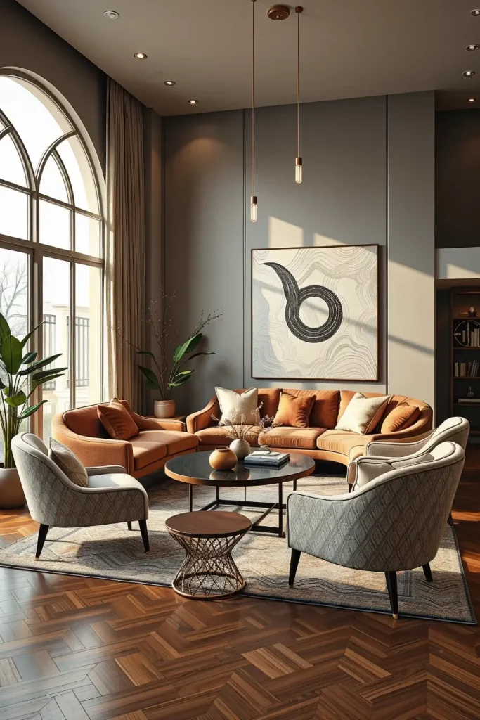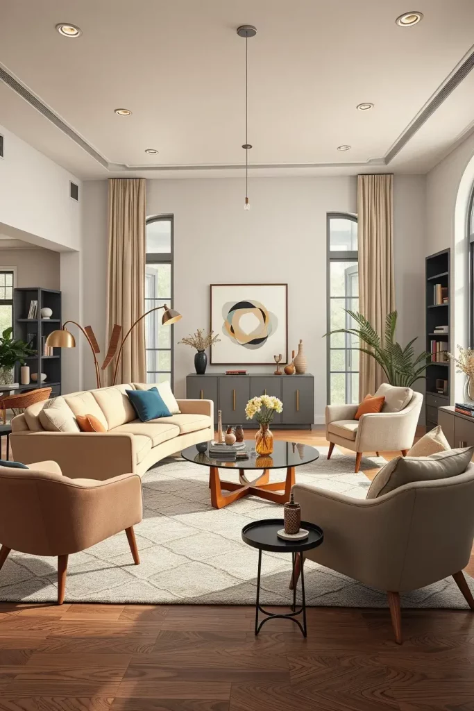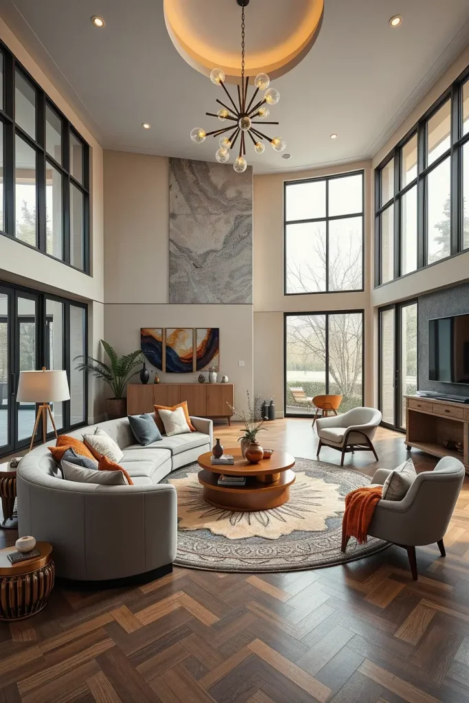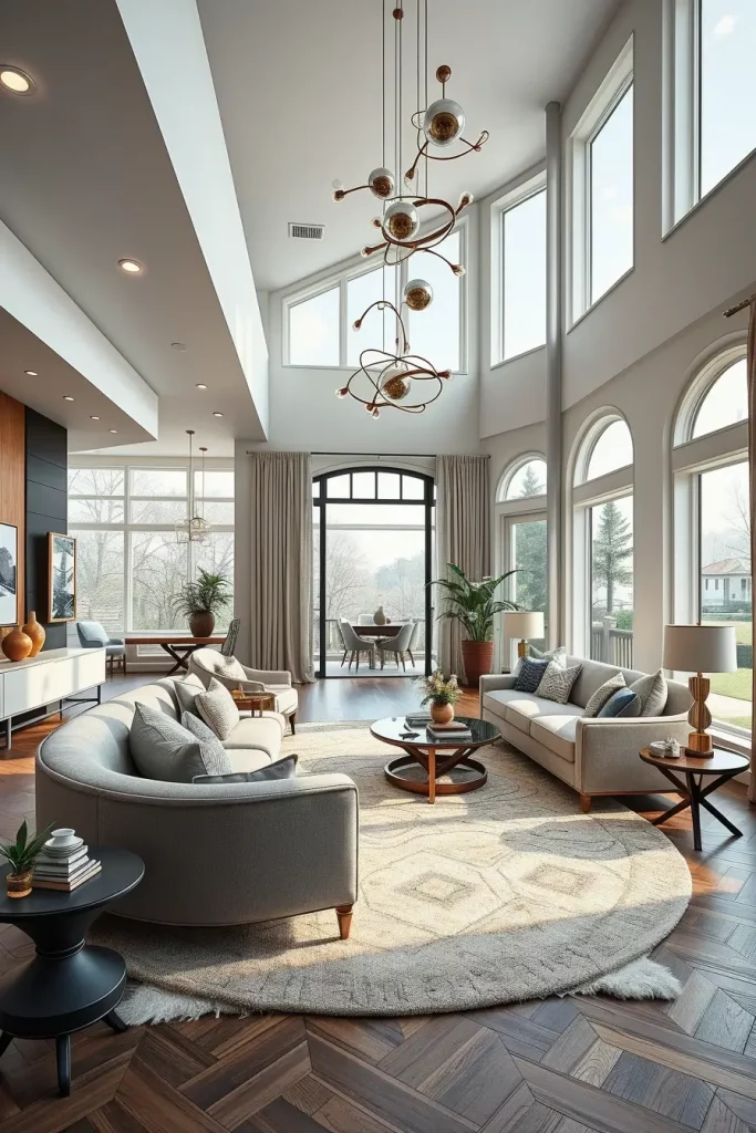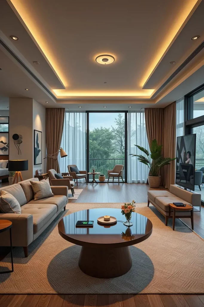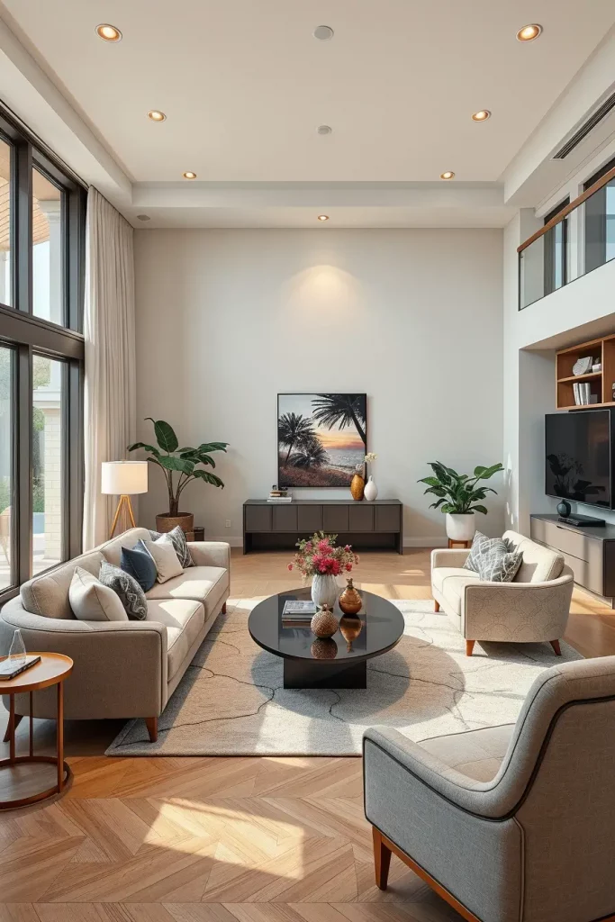 In furniture choice, I will opt to have oval coffee tables, curved sectional and modular seating that can be adjusted to suit various social contexts. Combining these with intelligent light systems and natural materials such as wood and linen contributes to the coziness and does not lose the modern style. All compositions must lead to harmony and balance.
