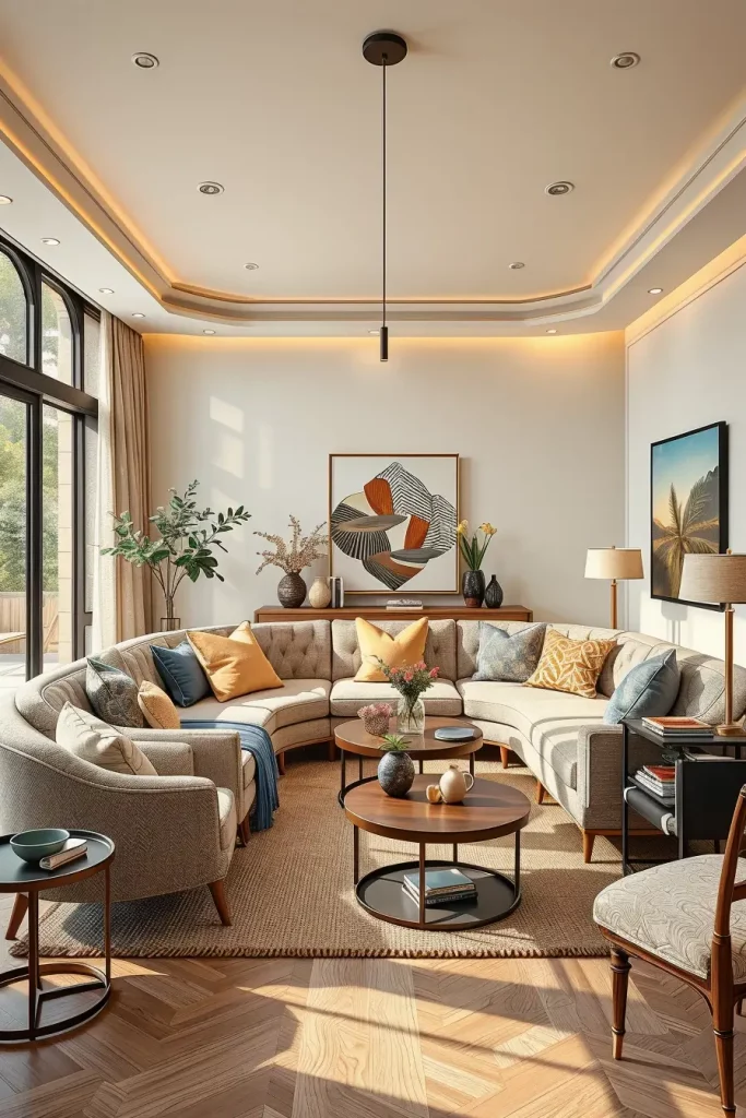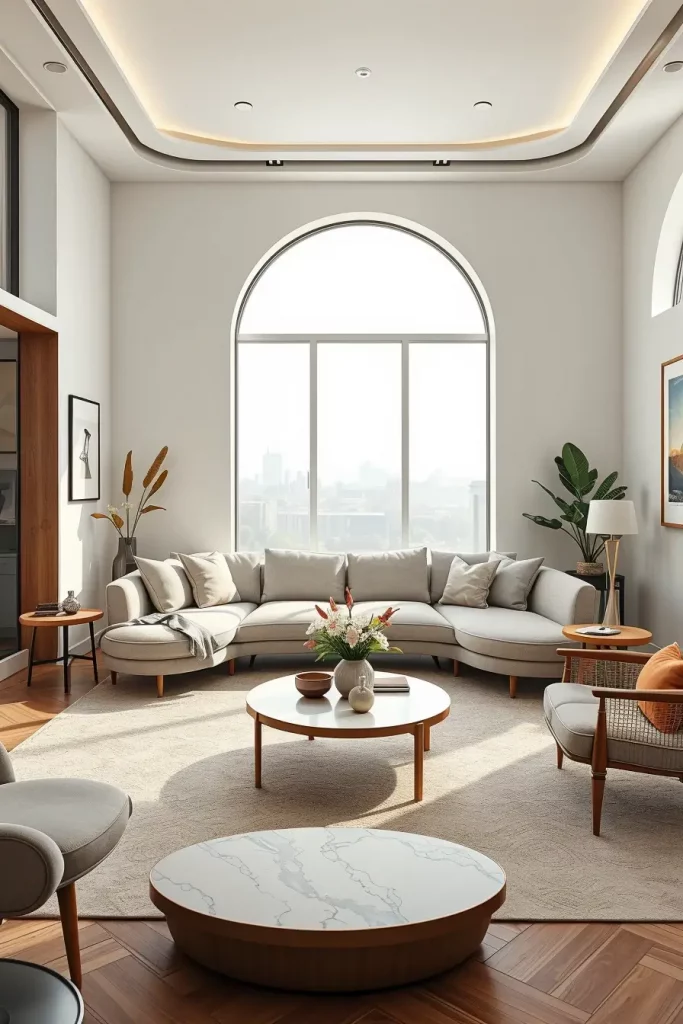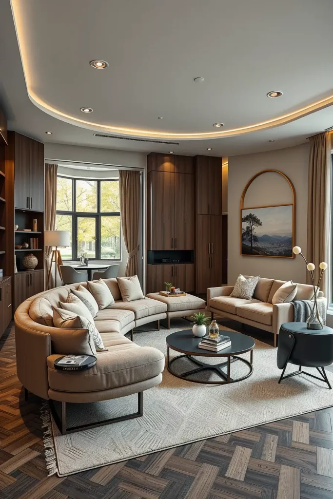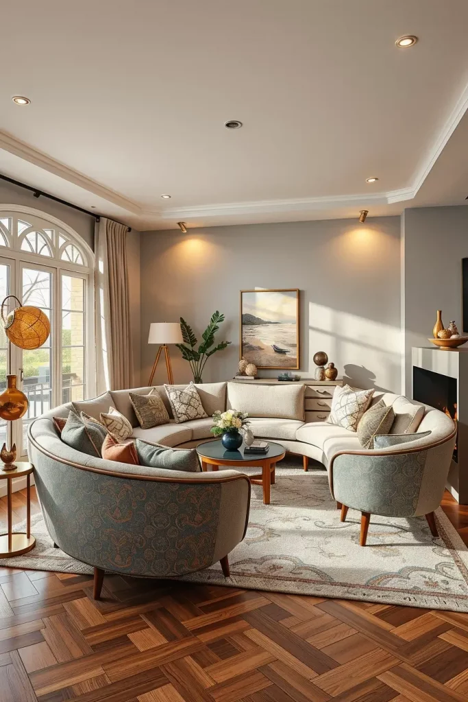 I tend to be an addition to curved sectionals with round coffee tables or oval carpets to ensure a visual balance. The emphasis on the sculptural form of the furniture is maintained with the help of soft tones such as ivory, taupe or muted gray. One or two designer accent chairs in clean lines create the unified appearance to the space, and the space sounds curated and relaxed.