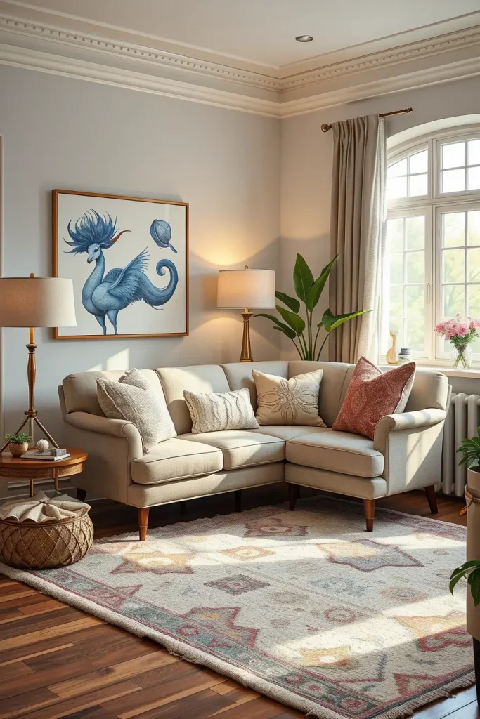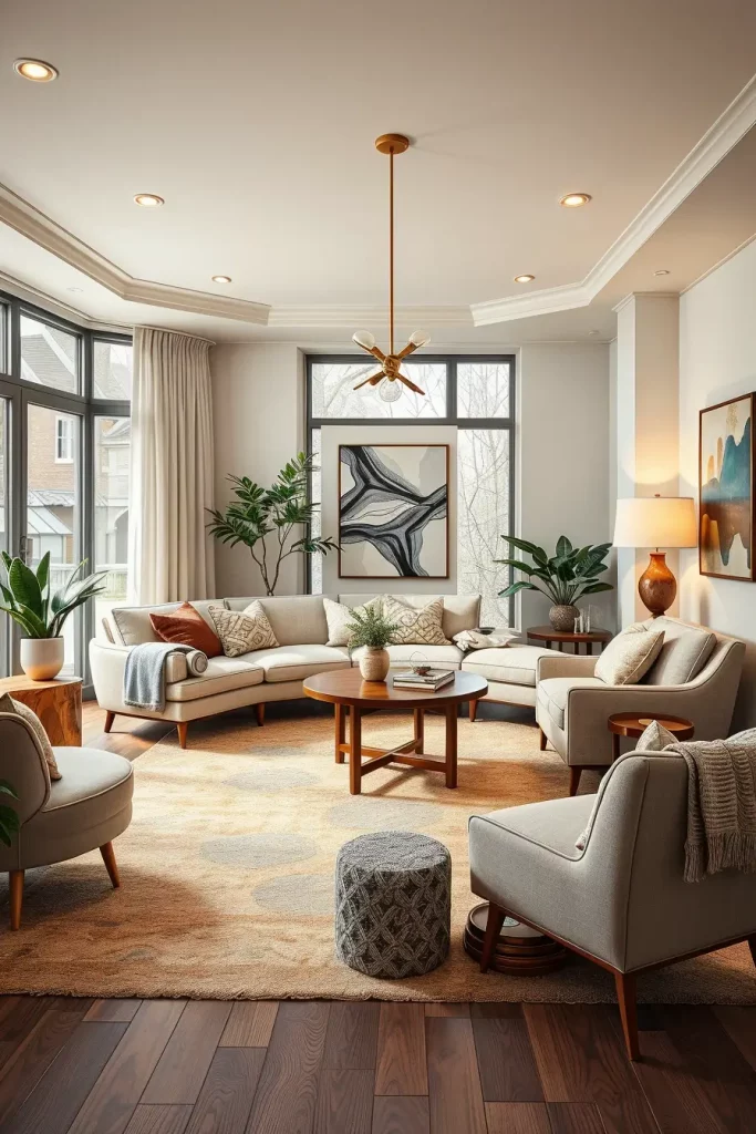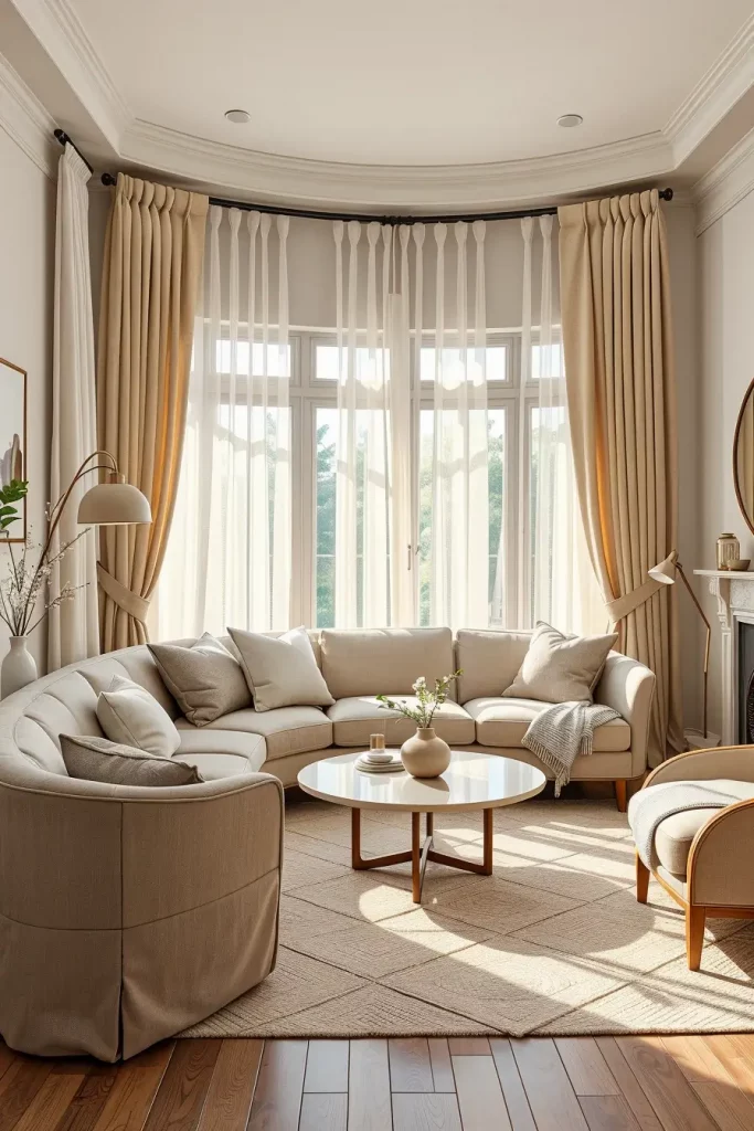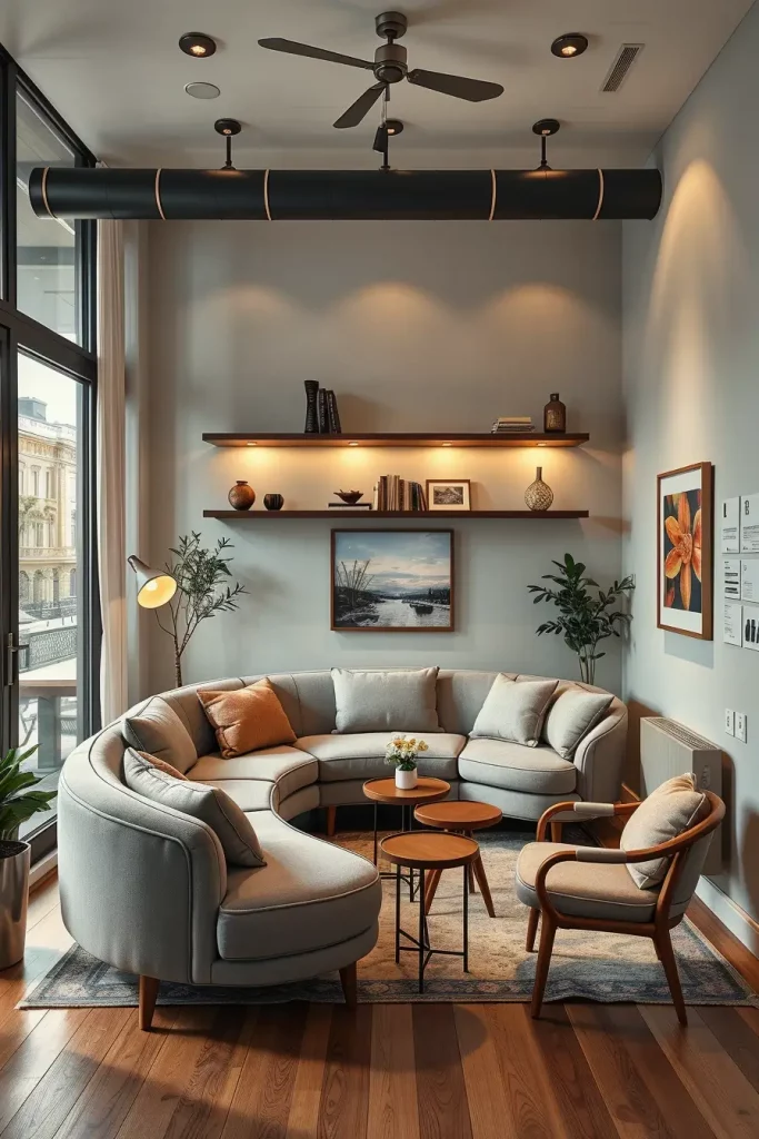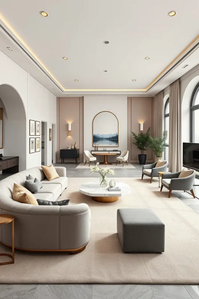 I tend to be an addition to curved sectionals with round coffee tables or oval carpets to ensure a visual balance. The emphasis on the sculptural form of the furniture is maintained with the help of soft tones such as ivory, taupe or muted gray. One or two designer accent chairs in clean lines create the unified appearance to the space, and the space sounds curated and relaxed.