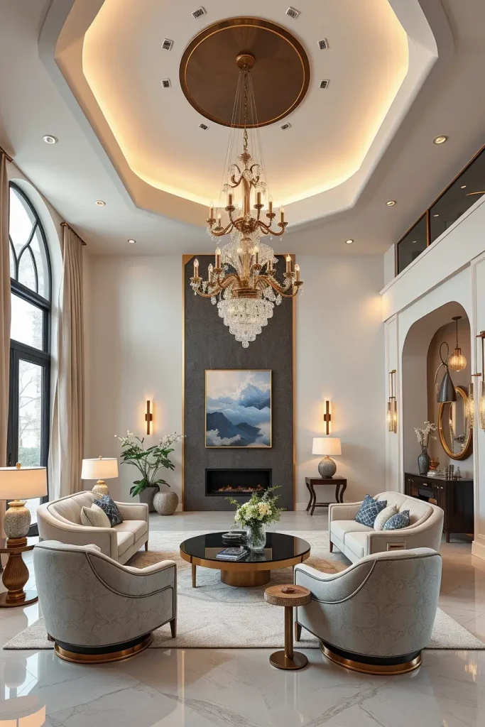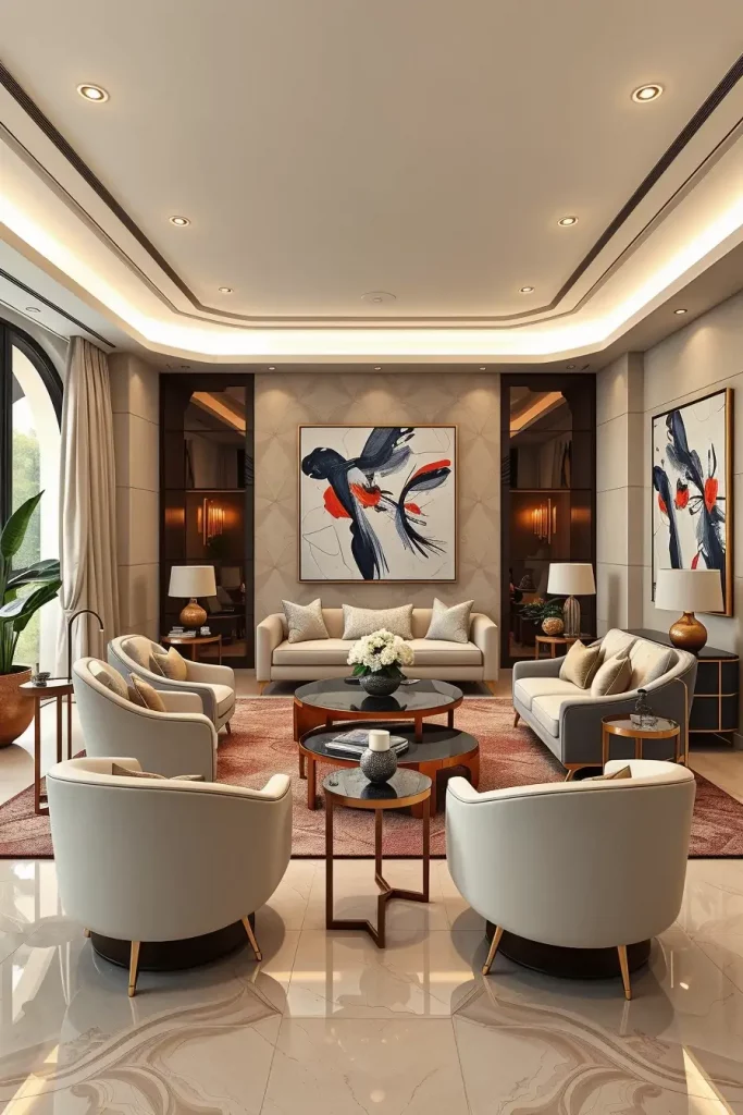 To further intensify this idea, the decoration of this place with the additions of sculptures might be considered, such as a streamlined vase, metallic figures, or curved mirrors, which will support the interplay of art and design. These ultimate flourishes provide a gallery-like feel, which is deliberately opulent.