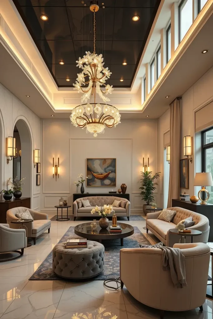The fixtures that I regularly use include sculptural chandeliers, LED wall sconces, and streamlined metallic-finished floor lamps. Dimming systems will enable adjustable atmosphere- comfortable evenings to lively parties. All the sources of light must emphasize the curves and shadows of the furniture deliberately.