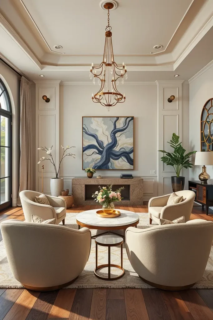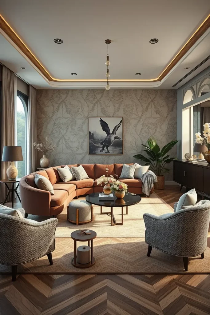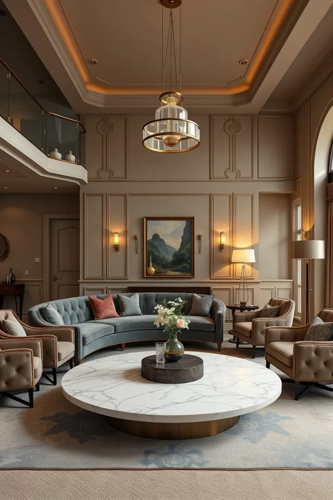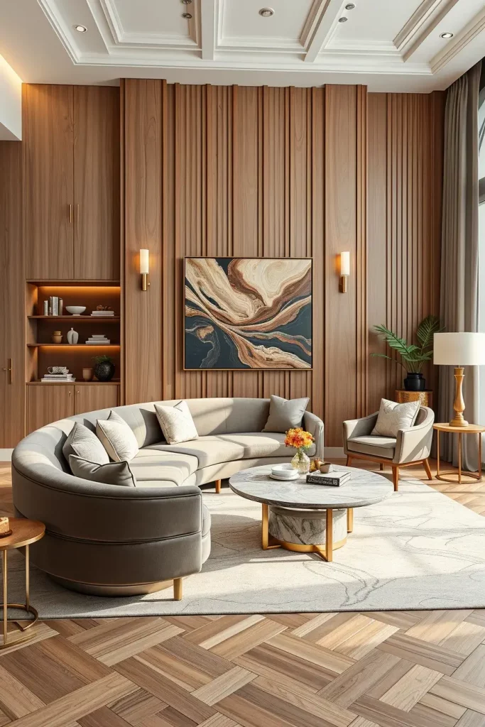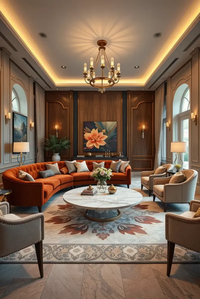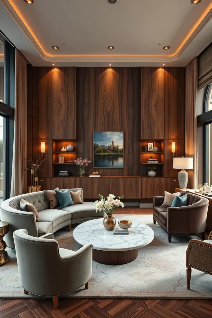 In this style I would use curved sectionals that are upholstered using expensive fabrics such as velvet or mixes of linen topped with made-to-order streamlined wooden consoles. An onyx or marble coffee table takes the shape of an oval that brings sophistication. To make the feeling of exclusivity even more prominent, I tend to add a custom-built shelving unit or a wall with fluted wood or stone. These details bring this room to the next level of something ordinary yet useful and classic.