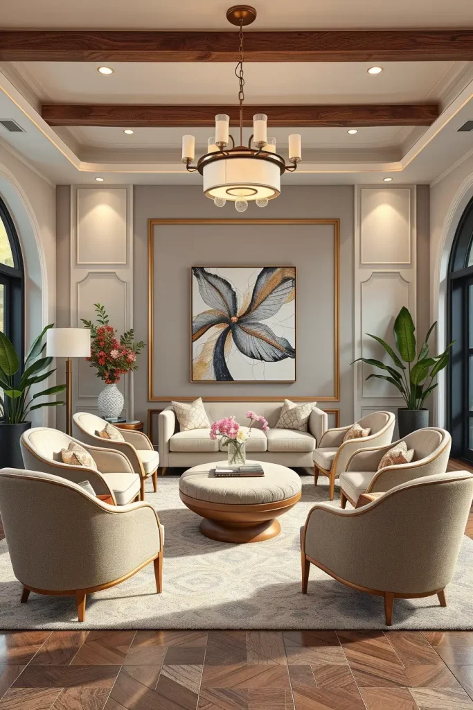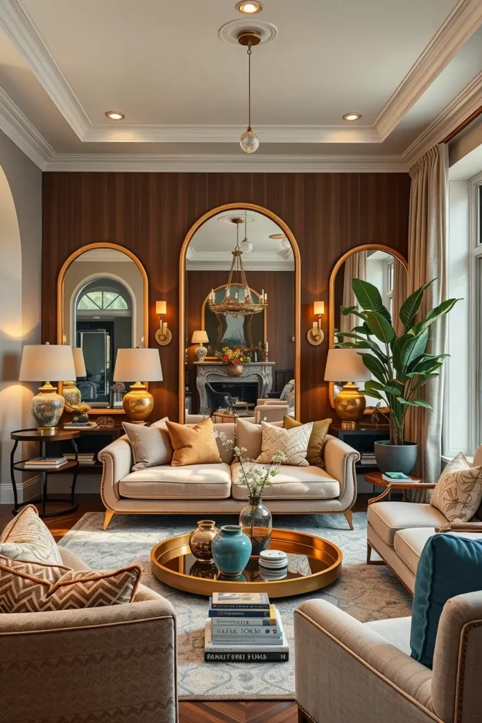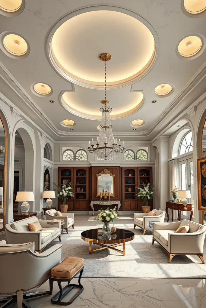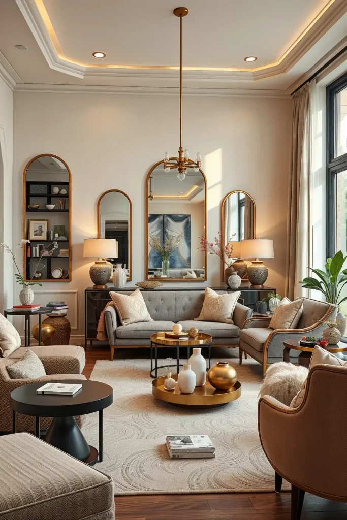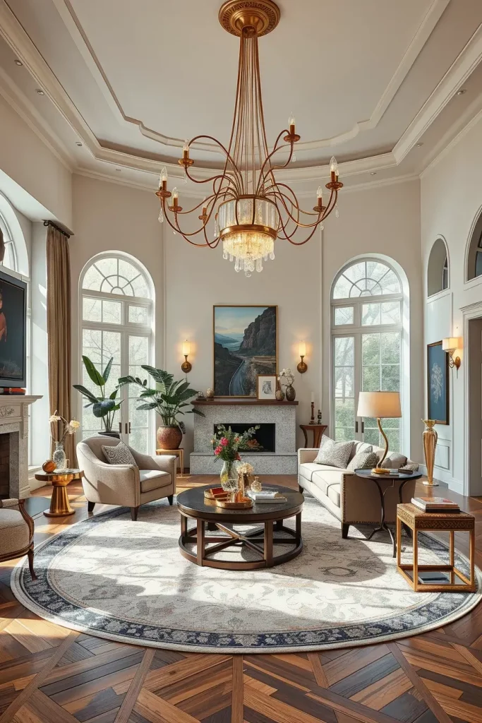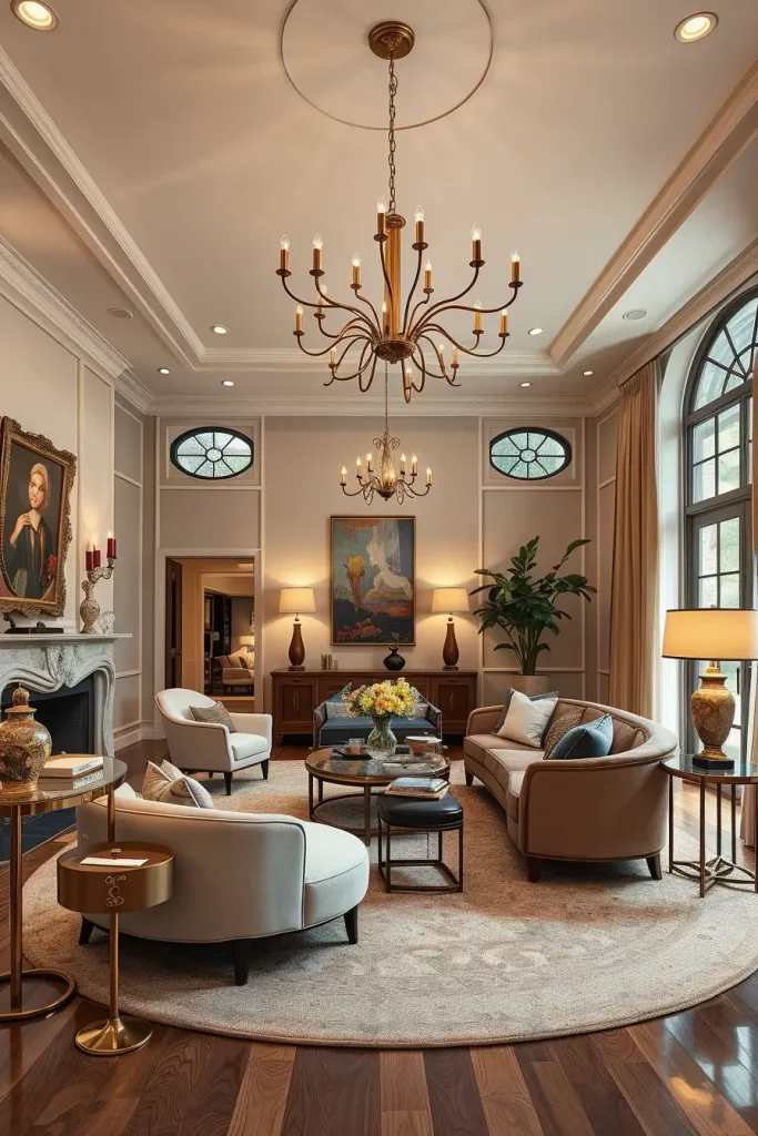 In this style I would use curved sectionals that are upholstered using expensive fabrics such as velvet or mixes of linen topped with made-to-order streamlined wooden consoles. An onyx or marble coffee table takes the shape of an oval that brings sophistication. To make the feeling of exclusivity even more prominent, I tend to add a custom-built shelving unit or a wall with fluted wood or stone. These details bring this room to the next level of something ordinary yet useful and classic.