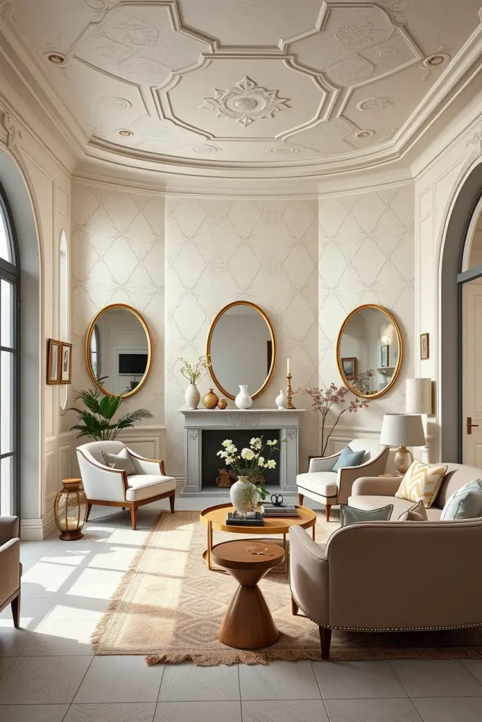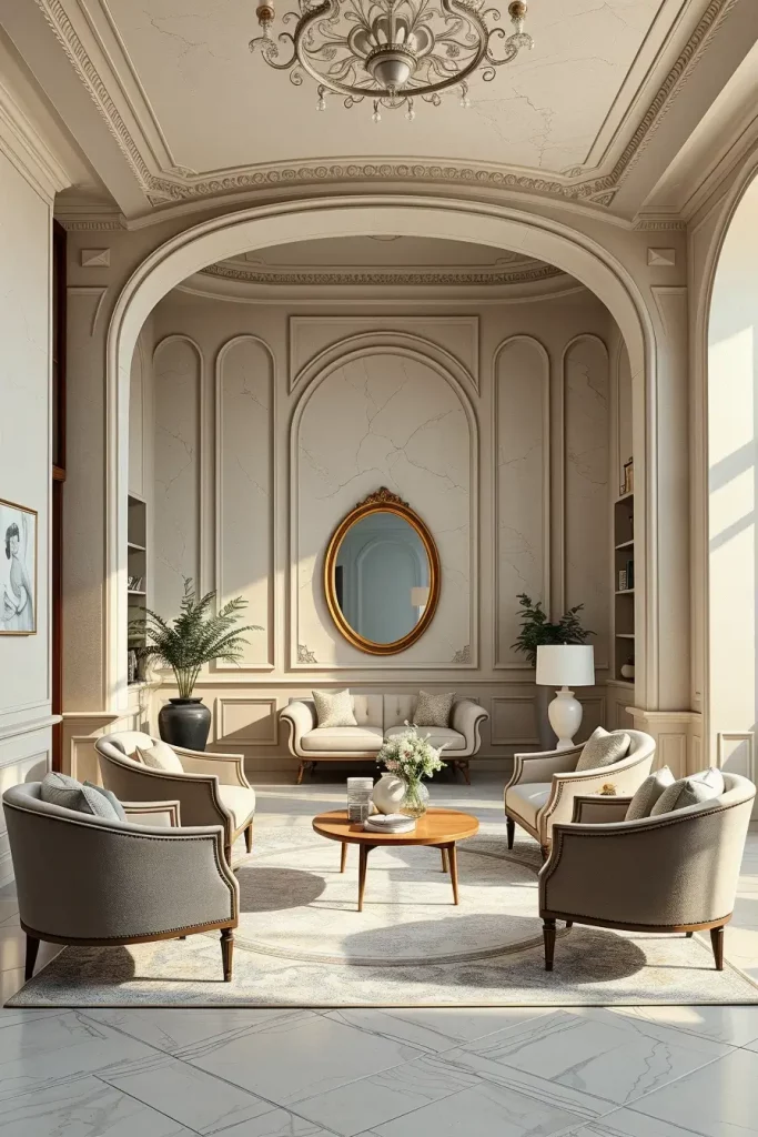 One of my projects also involved curved wall molding with soft oval mirrors that had the effect of adding depth and visual interest. It created the feeling of perpetual motion in the parlor. This combined with minimalist furniture and a well-placed lighting was what I wanted to have, designer-wise.