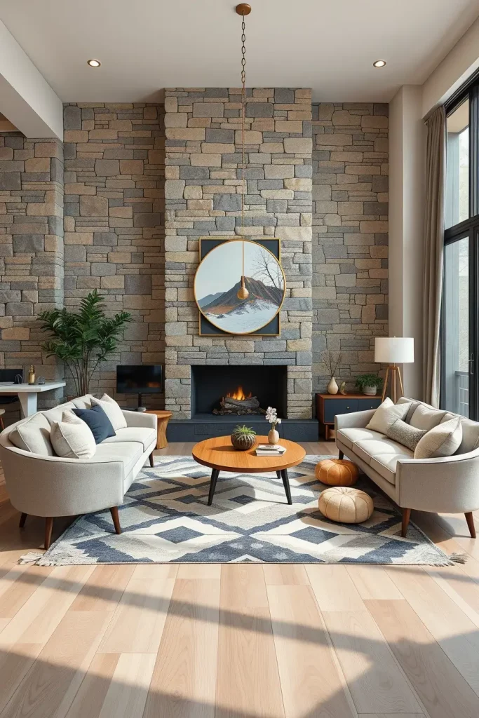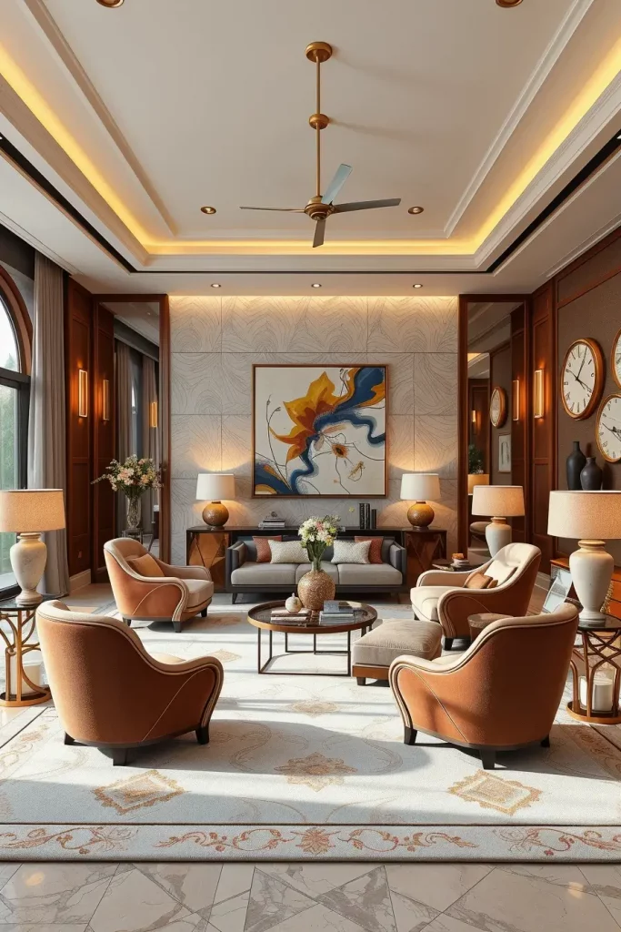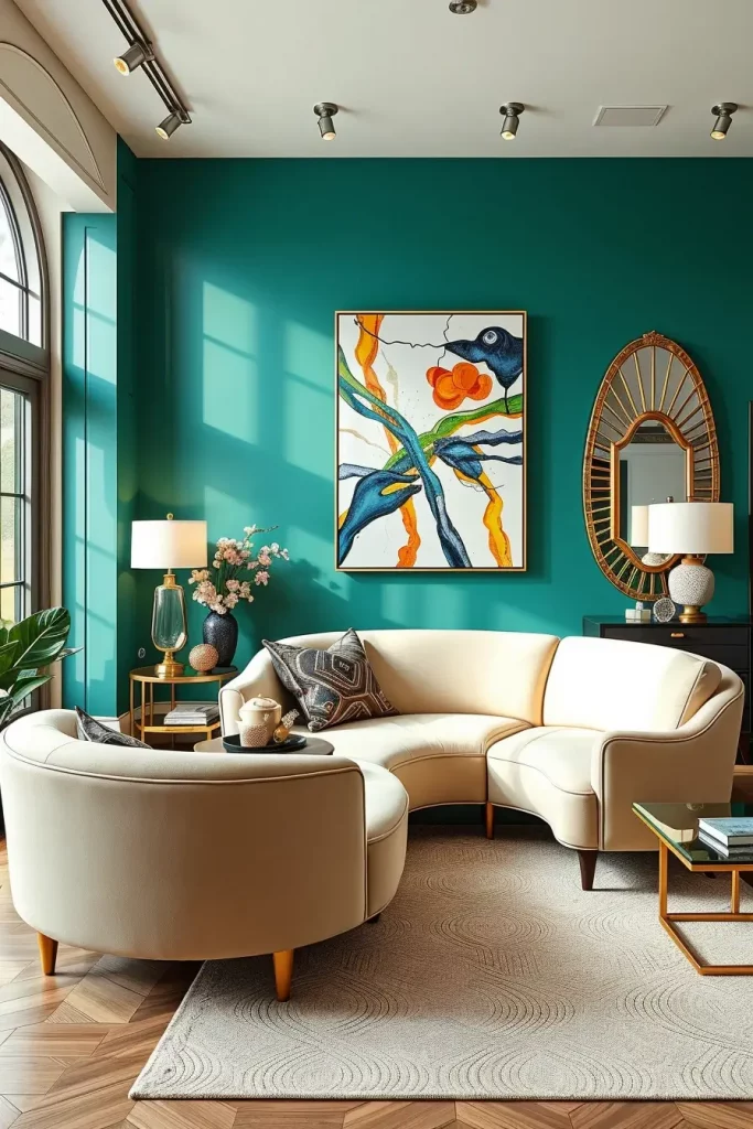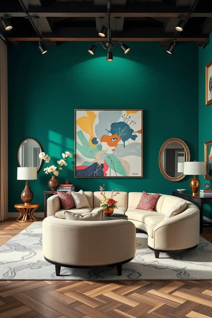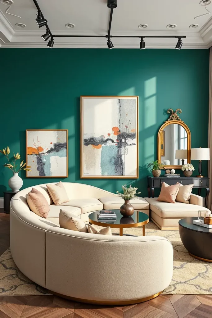As an illustration, I am fond of using wall accent colors with jewels such as emerald green, sapphire blue or deep terracotta. These colours are a perfect match with curved furniture, in particular sofas or lounge chairs of a neutral color. I would also suggest designer or local unique patterned works of art that are geometric or abstract in nature on the walls. The gallery-style display also introduces a personal touch besides uniting the decoration elements into a single whole. Again lighting plays a significant role, think of wall sconces or track lighting that draws attention to every artwork.