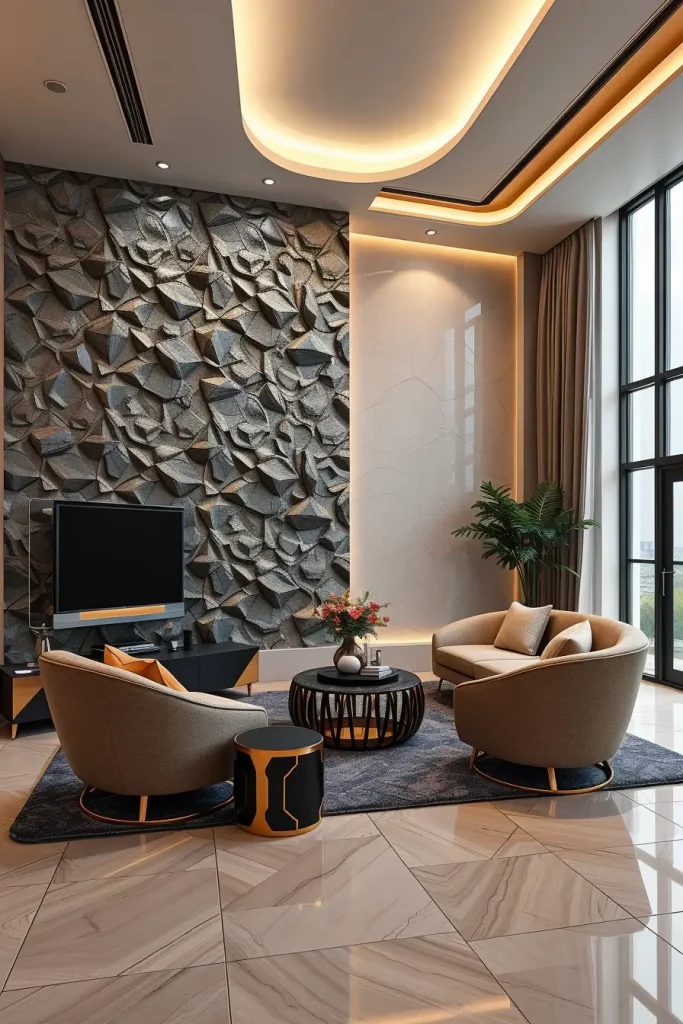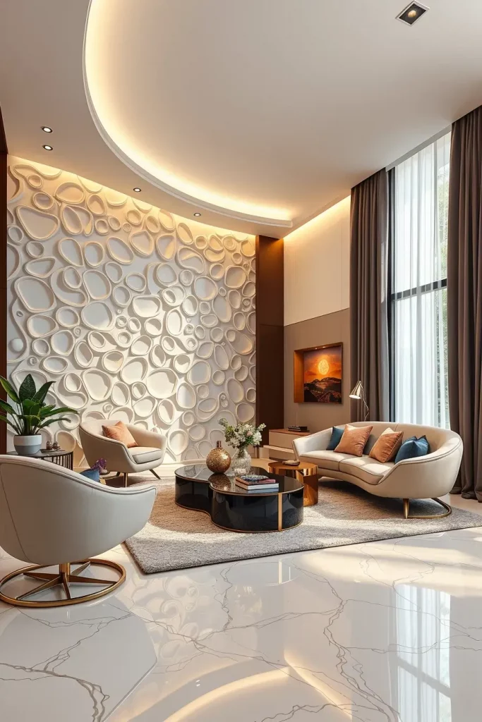 I am fond of the combination of sculptural walls and curved furniture with neutral upholstery to create a sense of balance. An example is a ribbed plaster wall in the background of a streamlined sofa that will not be overbearing on the senses. Lighting is also a major aspect, whereby, the relief on the wall may be highlighted by lighting behind the picture, which makes it visible.