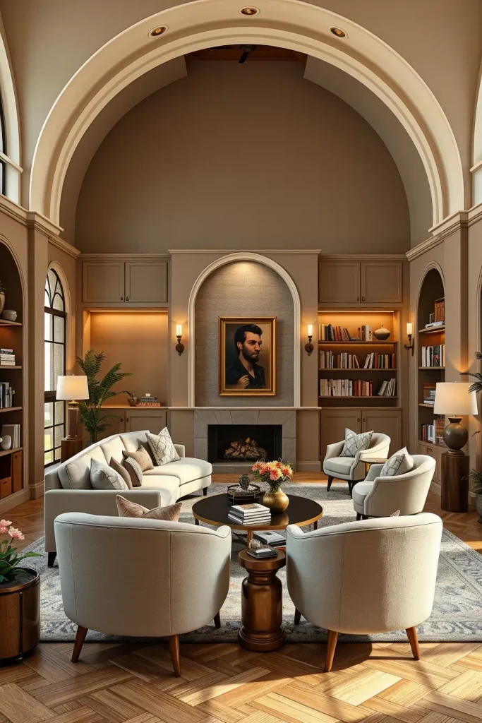 I enjoy the combination of curved sectionals, round armchairs and arched shelving following the flow of the room. There is even a curved console table under a mirror that can smooth an angular wall. These aspects make the parlor a sophisticated and comfortable area.