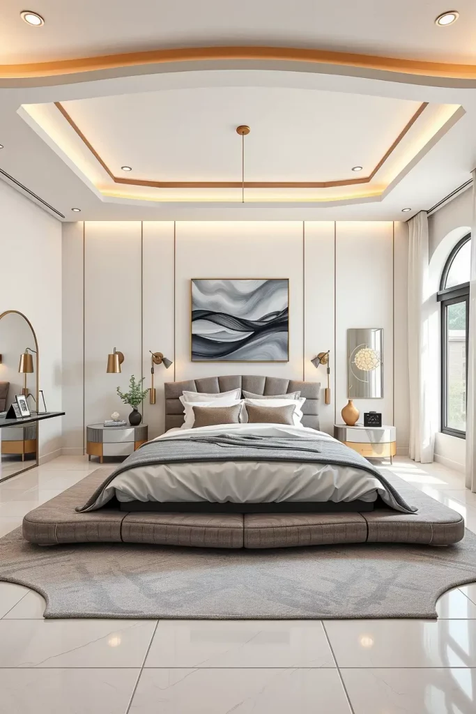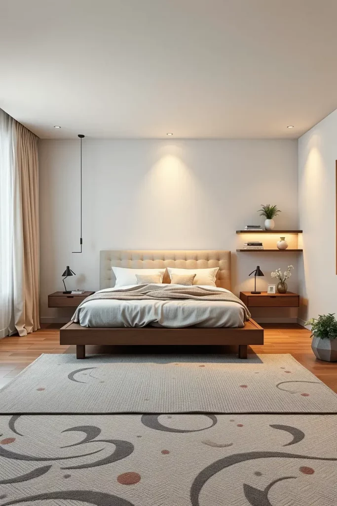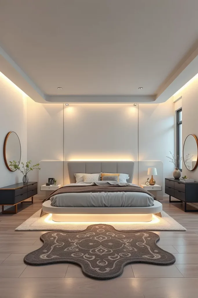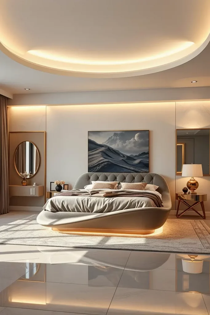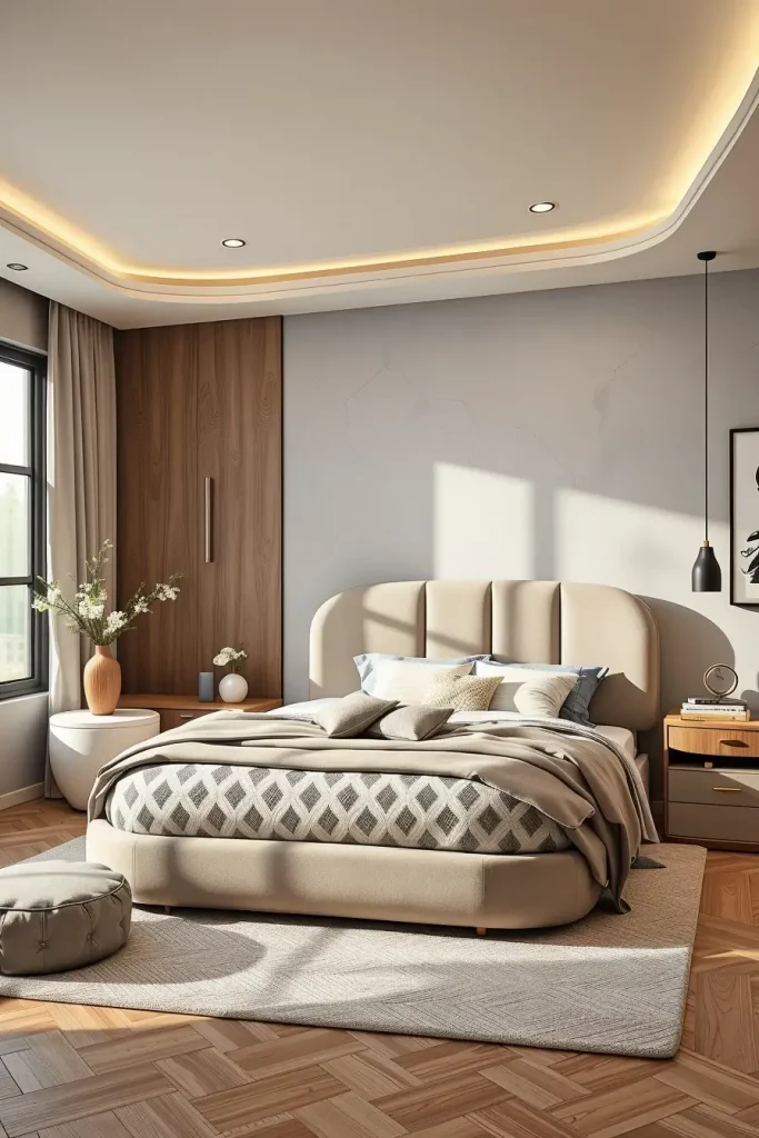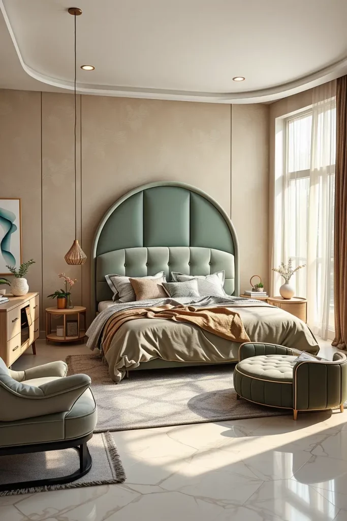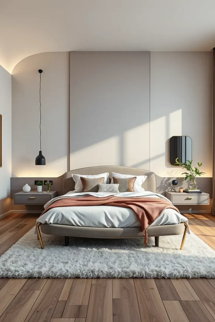Within my personal design style, I would suggest combining curved bed frames of modern design style with floating nightstands, matte wall treatments, and ambient LED lamps because of their organic shape. The bed is covered with a plush carpet and the side tables are kept to minimum in order to concentrate on the shape and the workmanship.