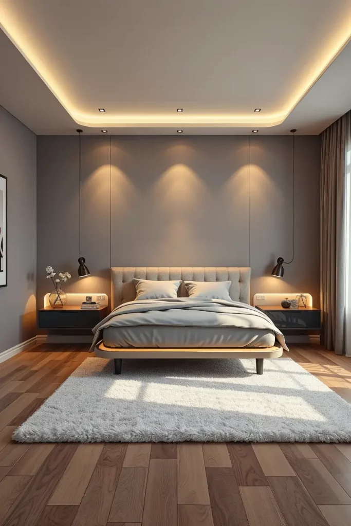 In constructing lighting systems, I would use a combination of several layers: ceiling lights, which can be used to administer general light, wall sconces, which would be utilized to provide reading light, and hidden LED back-lights that would help highlight the lines. These components also complement well with the aesthetic or art based bed designs with smooth silhouettes and rounded edges. The neutral wall color, such as ivory or stone, will reflect the light, thus, looking like it is a larger room with fewer details.