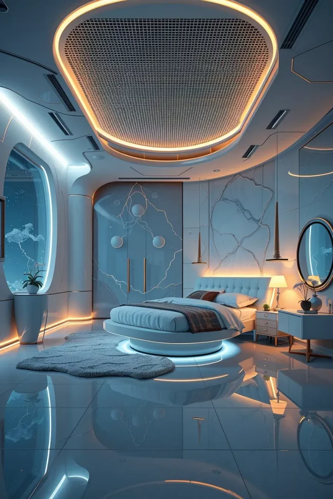 As a personal touch, I would place such a futuristic bed with a sleek piece of furniture, minimal dressers, and compartments that cannot be seen or used as storage, voice controlled lamps. The inbuilt lamp on the bed frame provides a soft light which adds a fine touch to the overall appearance of the whole room, particularly during the night.