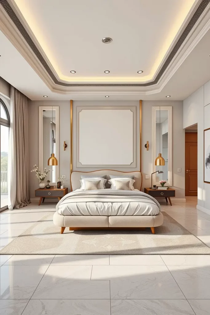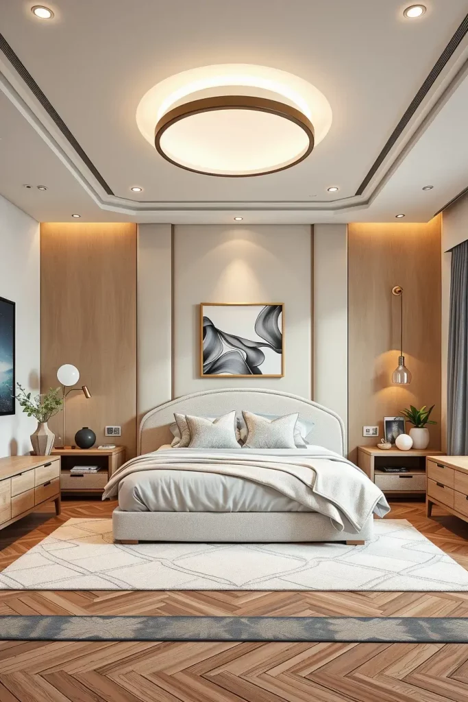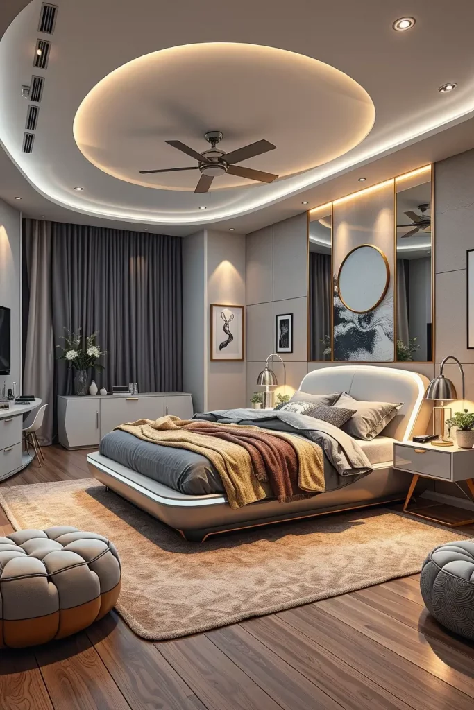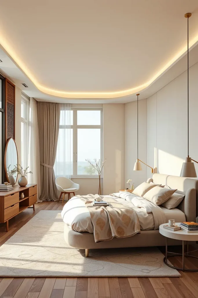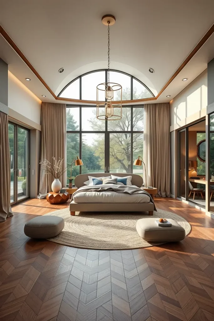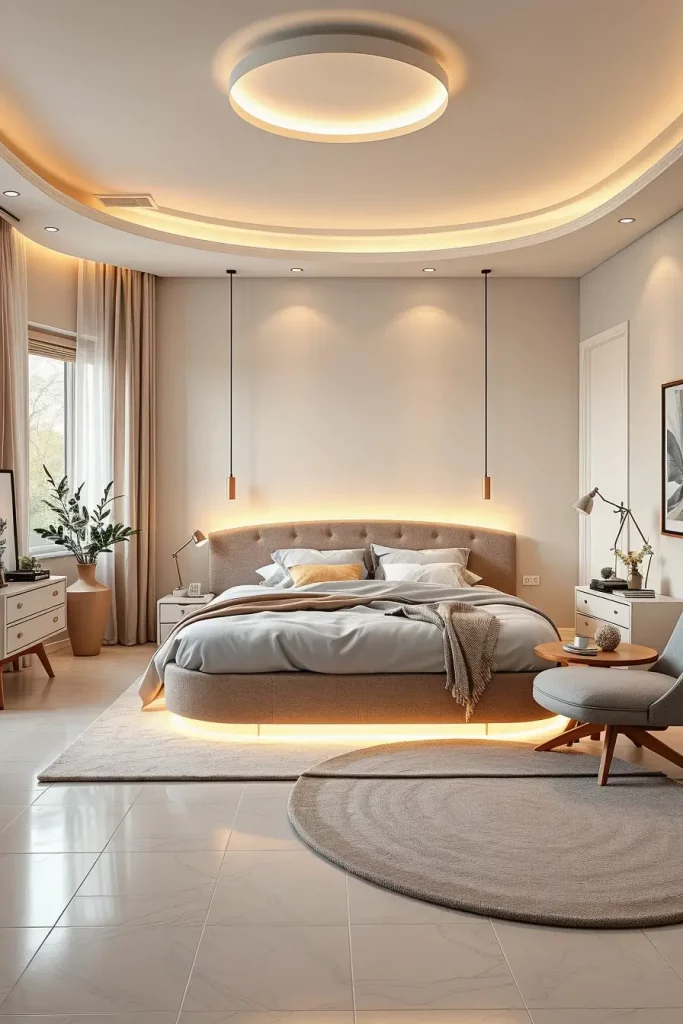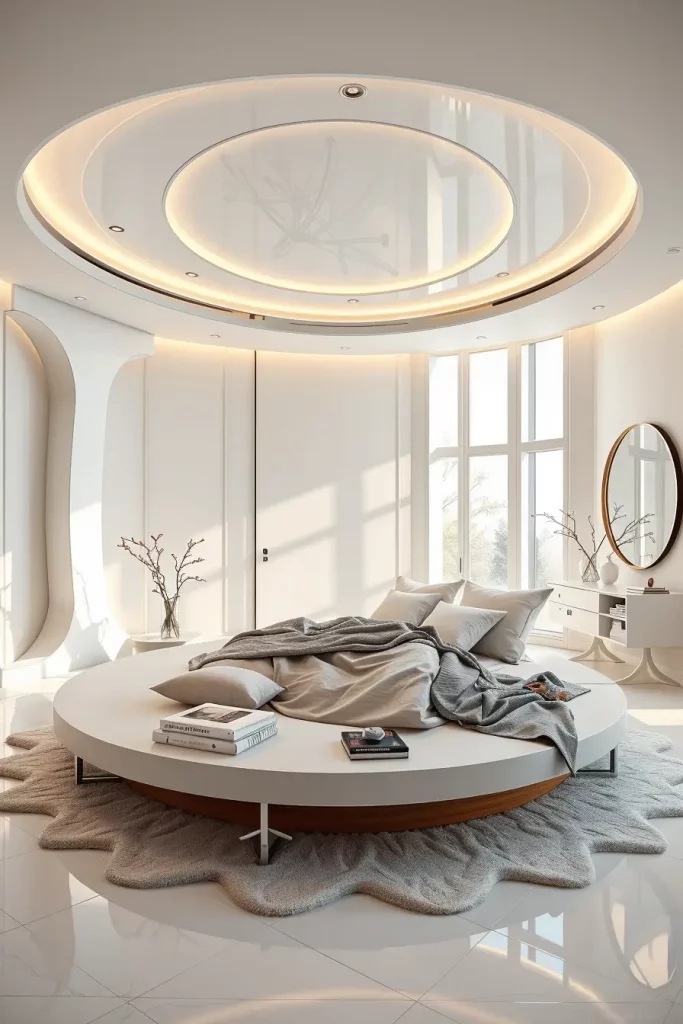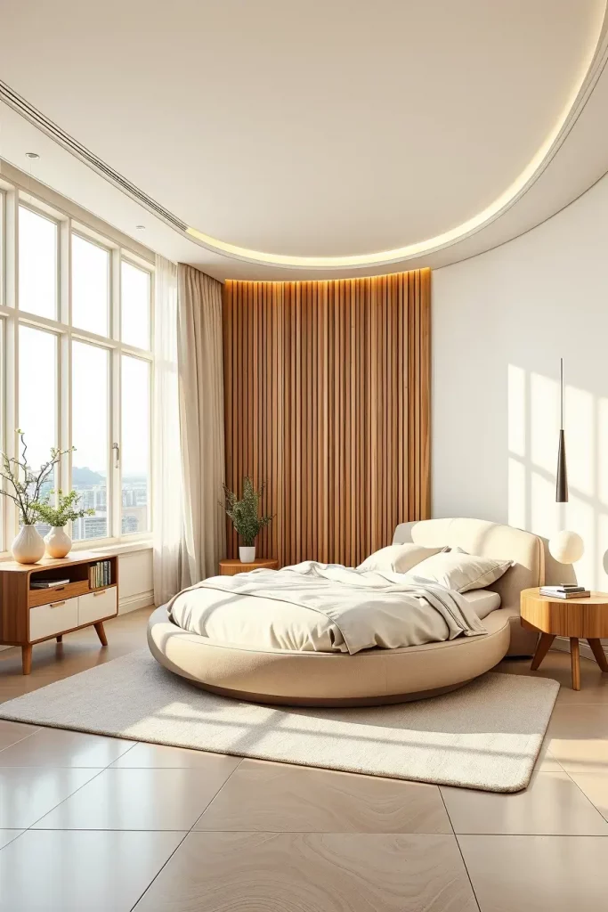Personally, oval bed and circle rugs, pendant lamp, and panoramic windows are the best combination. It has soft, neutral or metallic accents which stress its modernity. The trick is in balance – other items such as wardrobes and side tables must have smooth, rounded edges in order to sustain visual harmony.