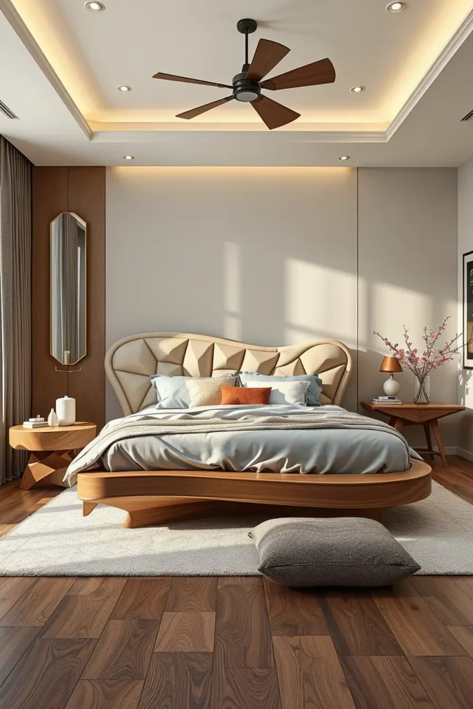 I base my room designs in my practice on these non-conventional forms. The geometry is counterbalanced by rounded rugs, curved seating and flowing lines of wall art. Harmony in the visuals is also of paramount importance, and the bed does not seem to be an outsider. The lack of decor and the use of neutral walls make the shape of the designer element shine through.