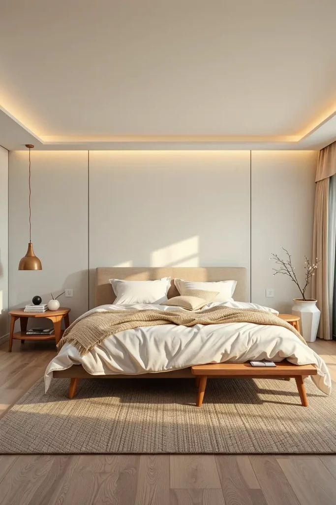I think that what most minimalist neutral rooms lack is dimension. Dying backlight behind the headboard or light paneling on the walls can make the plain design something extraordinary.
