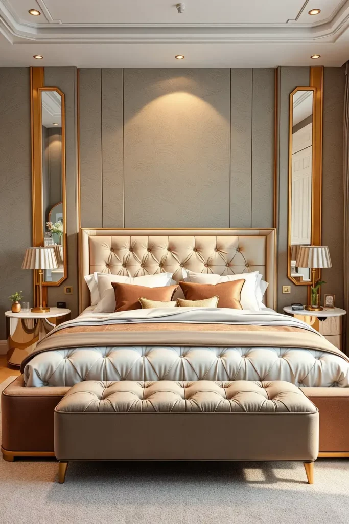 I tend to suggest sculptural headboards, bold upholstering or curved metal frames as the accent. The use of complementary colors on the wall, such as dark taupe or dull olive, forms a classy background.