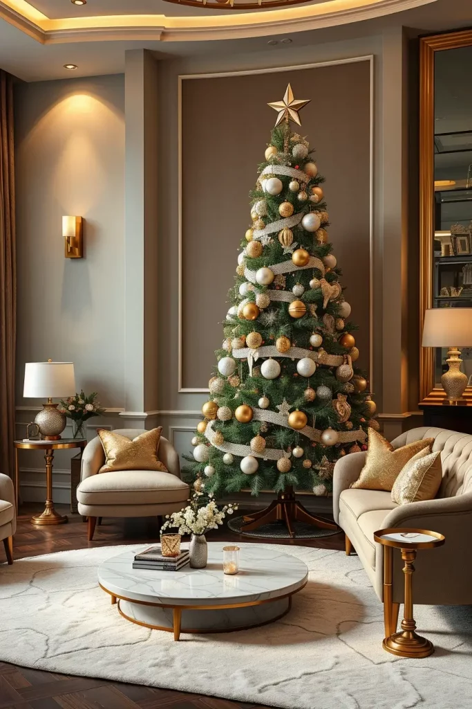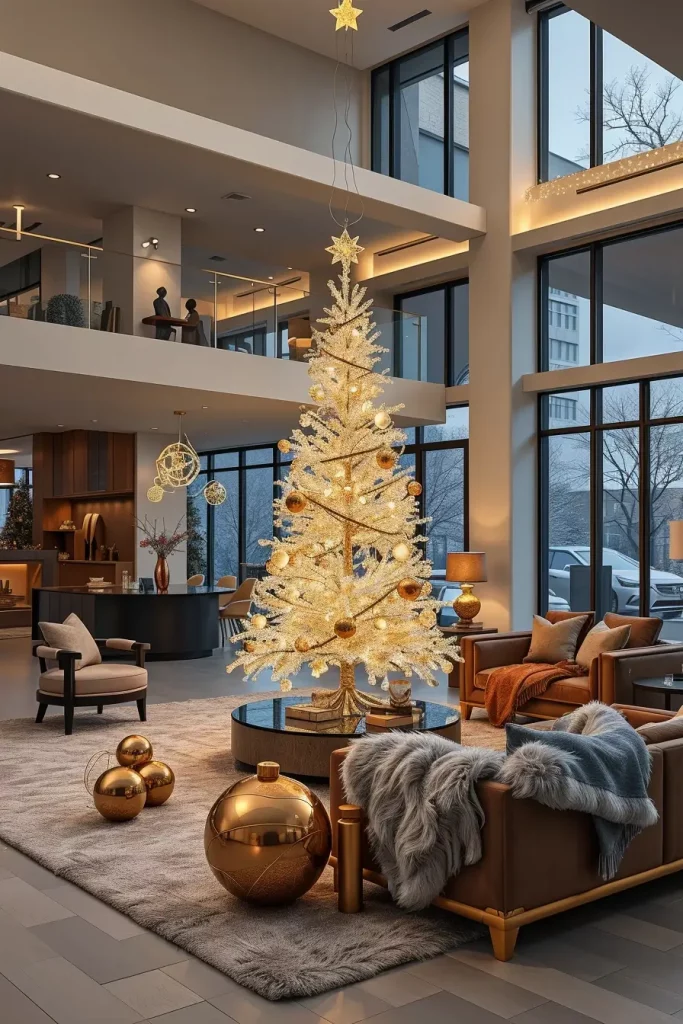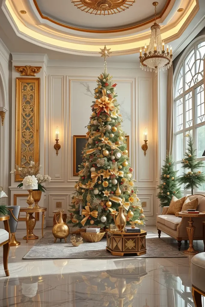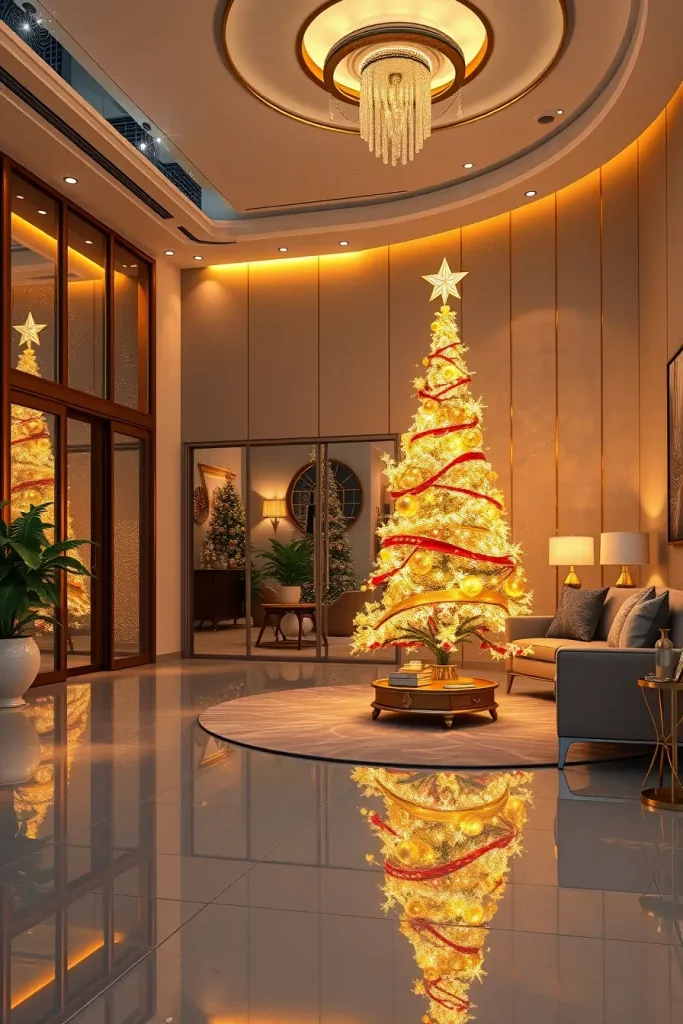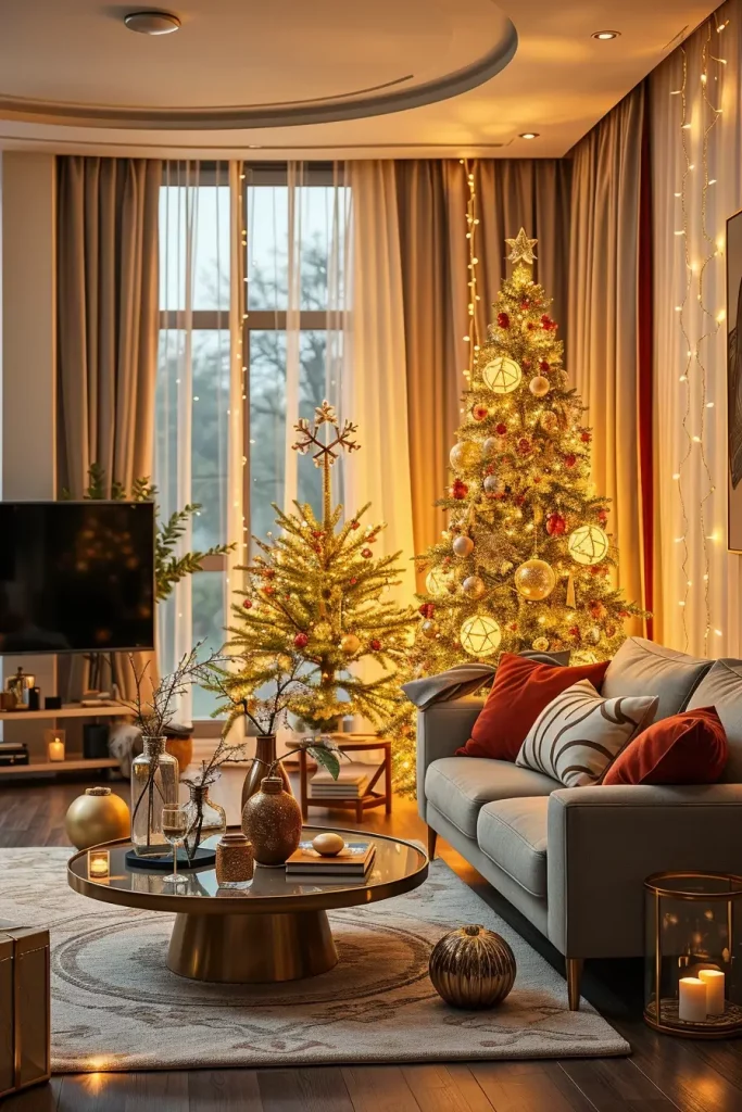 According to my experience and recommendation by Forbes Home, I have noticed that symmetrical arrangement in big areas adds sophistication. Two smaller golden trees on either side of an entrance may serve as well as one tremendous exhibition. My preference is personally to mix gold and soft white lights to achieve a classic look that is elegant and has a classic appeal.