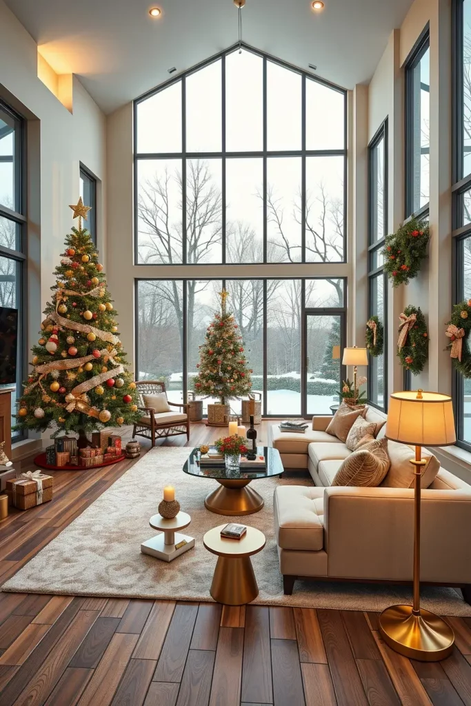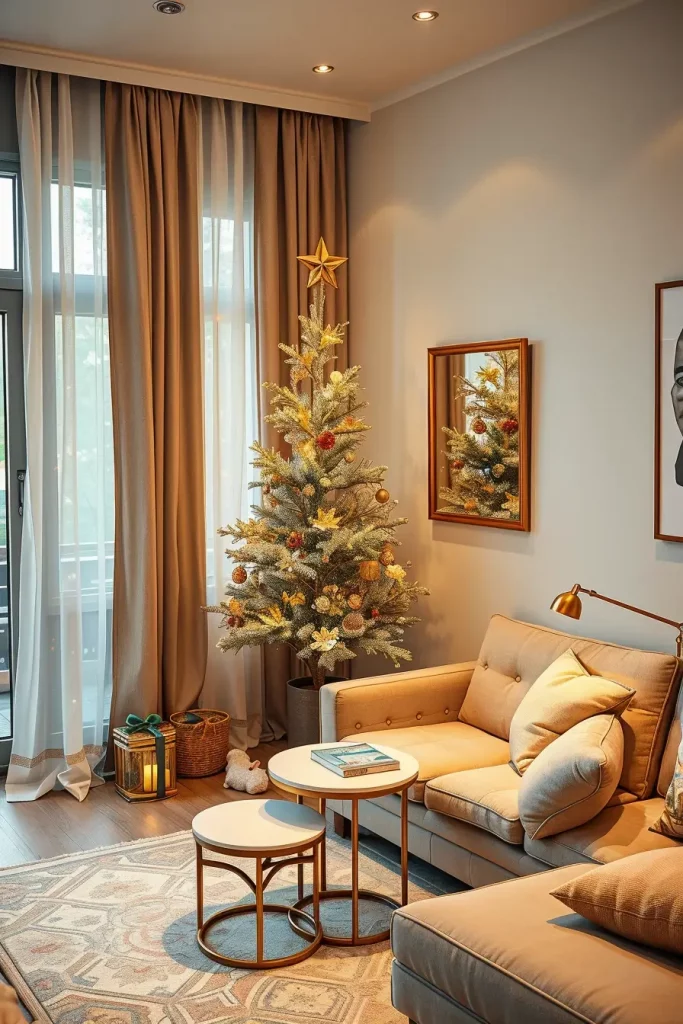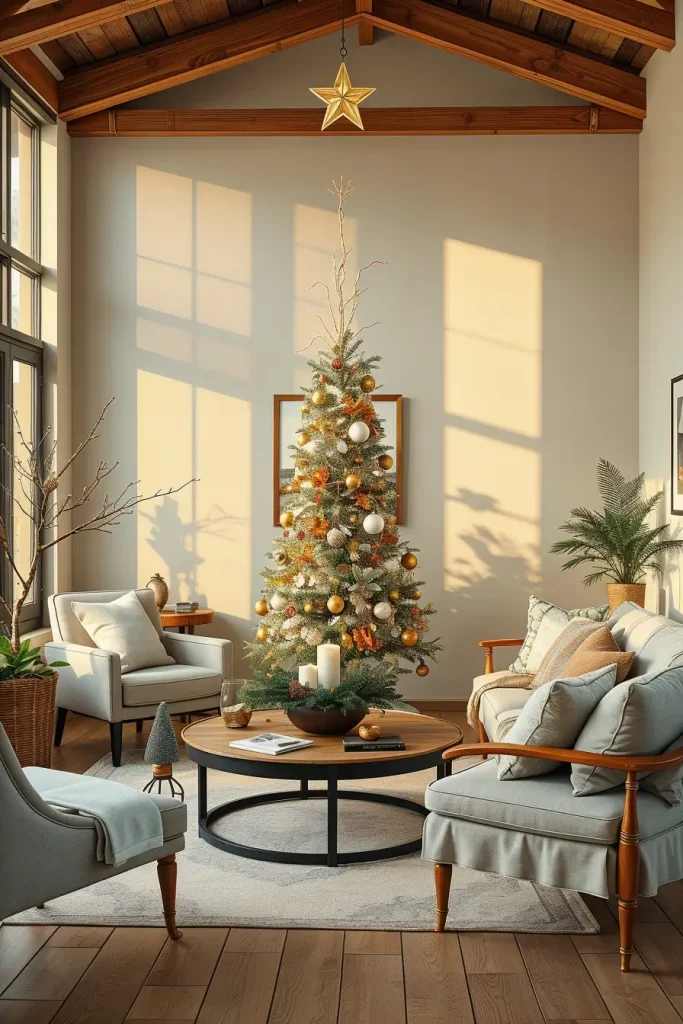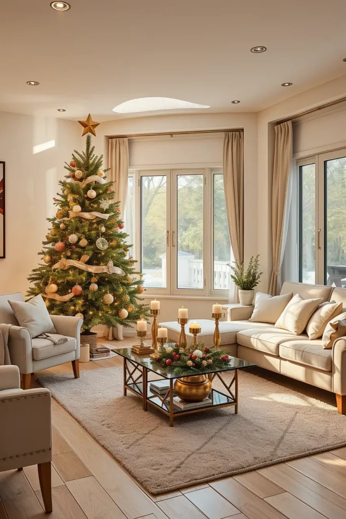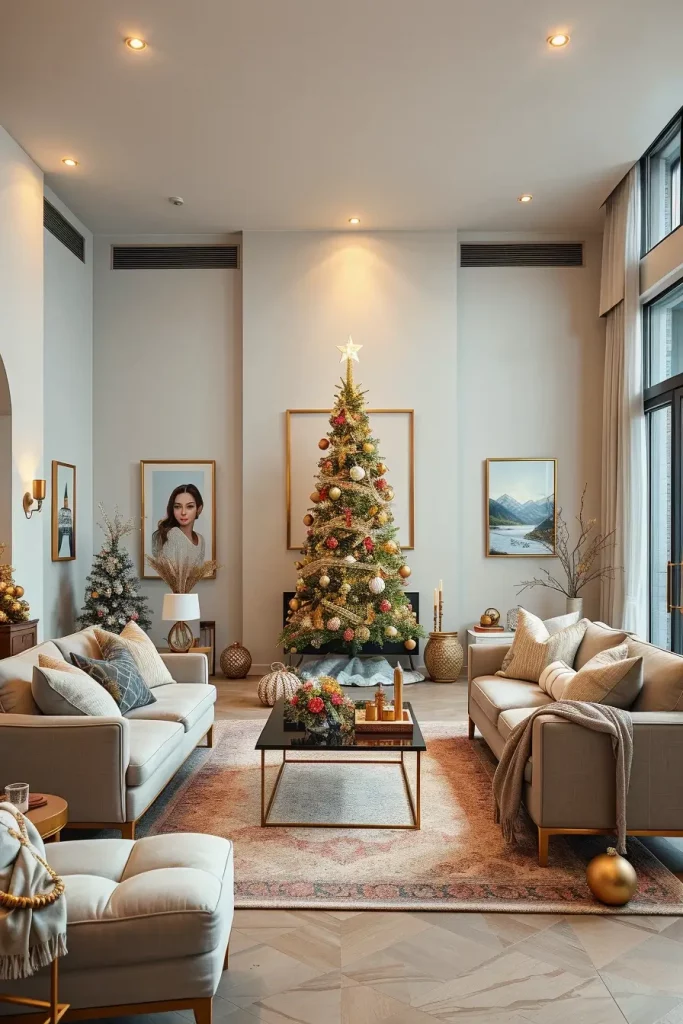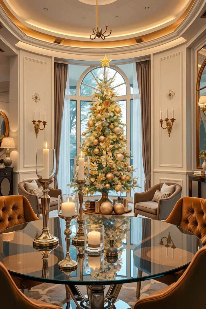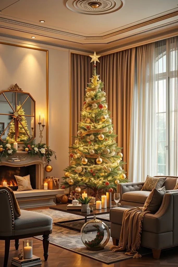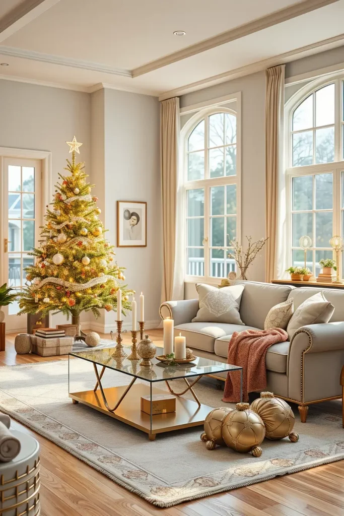 In order to do this, I organize furniture in a manner that naturalizes the tree. A smooth sofa with either cream or gray colors will provide a ground to the scene, and there are glass coffee tables and metallic candleholders that will shine under the light with faint glints that will be spectacular. My other favorite elements are gold-rimmed picture frames or a huge wall mirror in order to reflect the sparkle of the decorations. One should not be cluttered; simplicity means that one has to make each golden detail feel planned and designer.