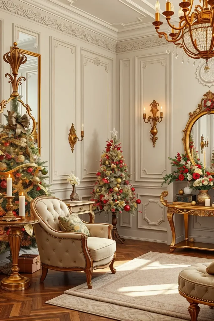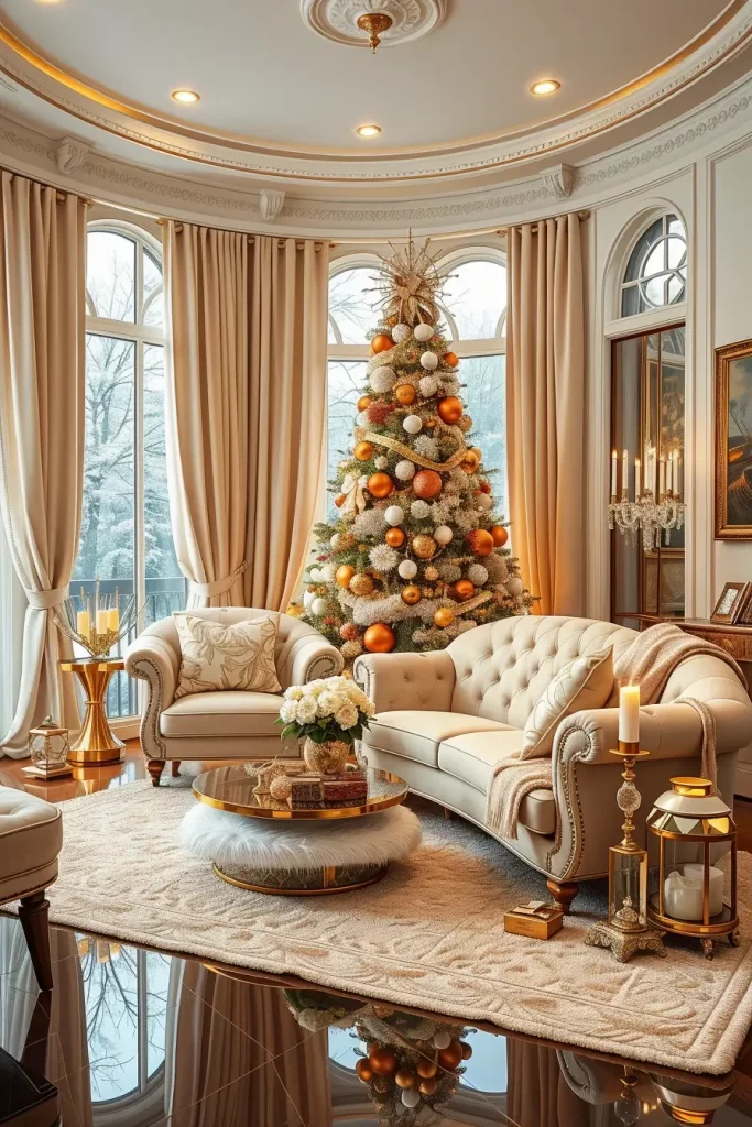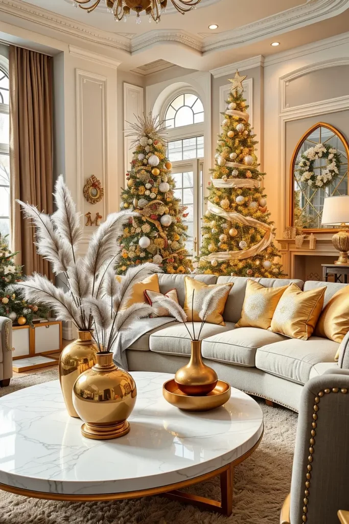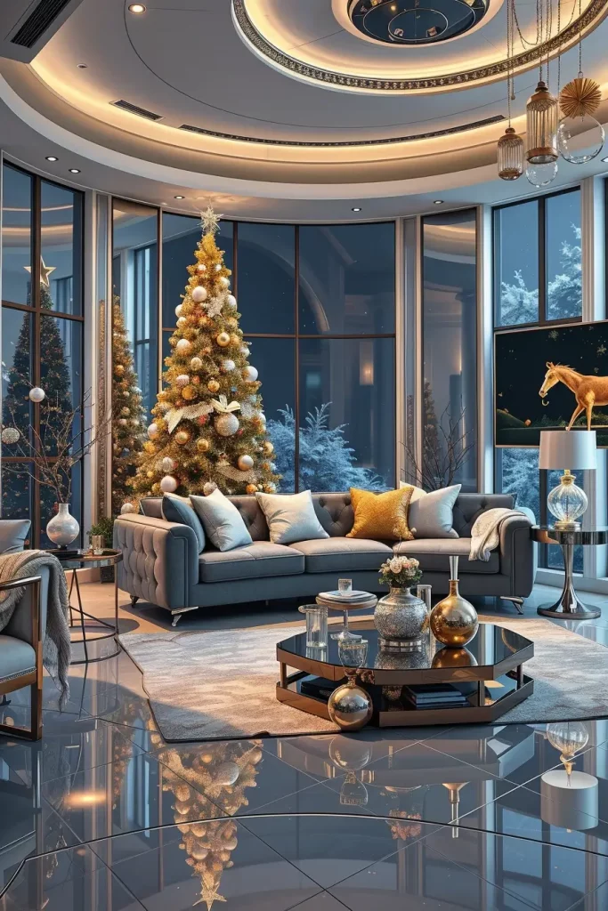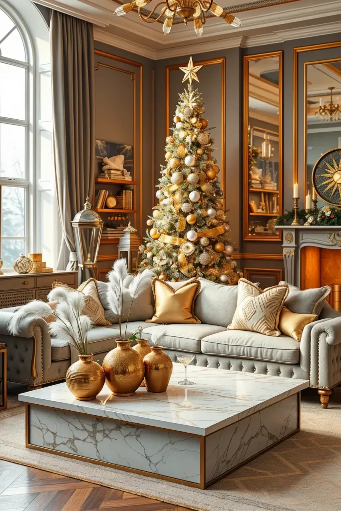 As far as the decor is concerned, I prefer gold-bordered candle holders, silver reindeer idols, and bronze-framed mirrors. These minor inclusions are the ones that bind the theme and at the same time create a visual harmony. The interior is topped off with a neutral couch topped with golden throw pillows and a glass or marble coffee table so the metallic ornaments self-reflect. Balance is the most important thing, one metal tone must complement the other metal tone and not take away its place.