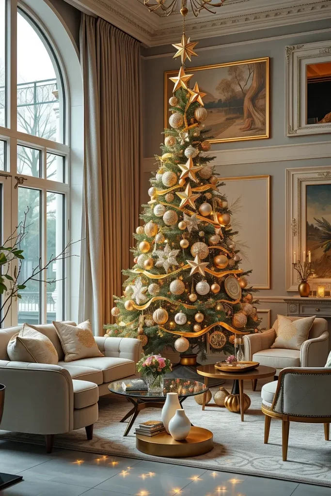 The mixture of gold and silver Christmas trees is a bold and sophisticated decision that makes 2025 a symbol of the new grace. I really like this combination as it is futuristic and designer as though in a fancy holiday movie set. The metallics of the two tones are a perfect match and they reflect every bit of light.