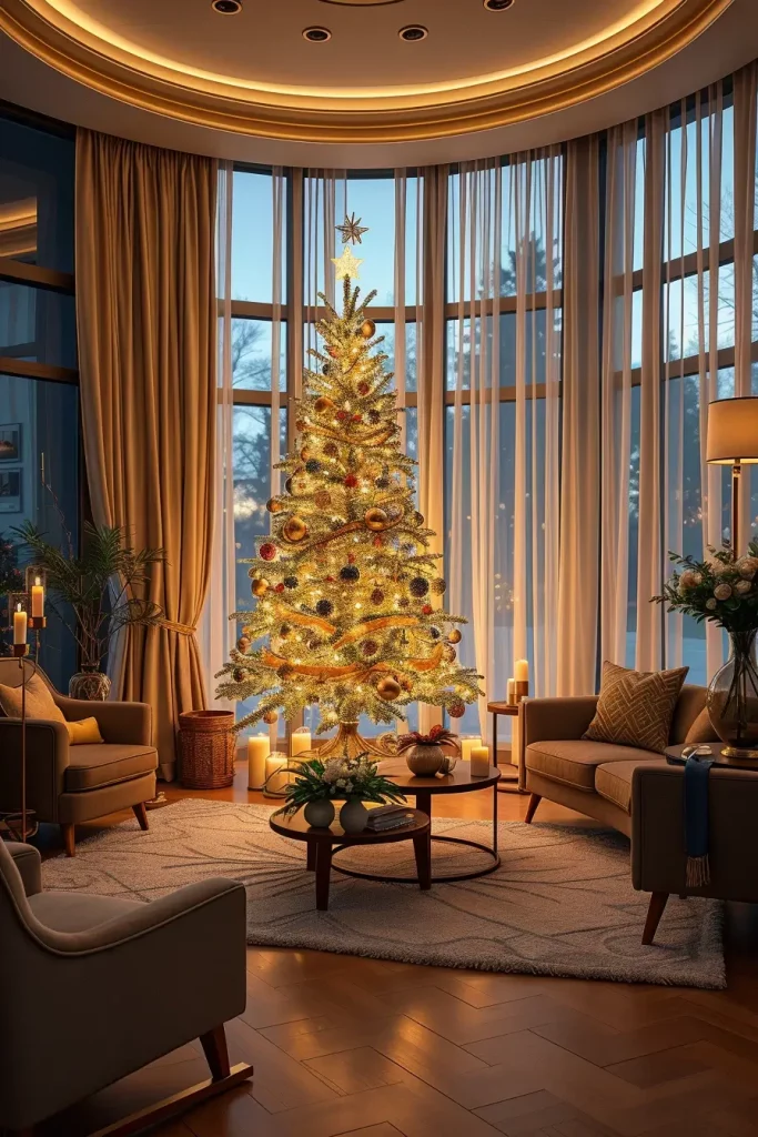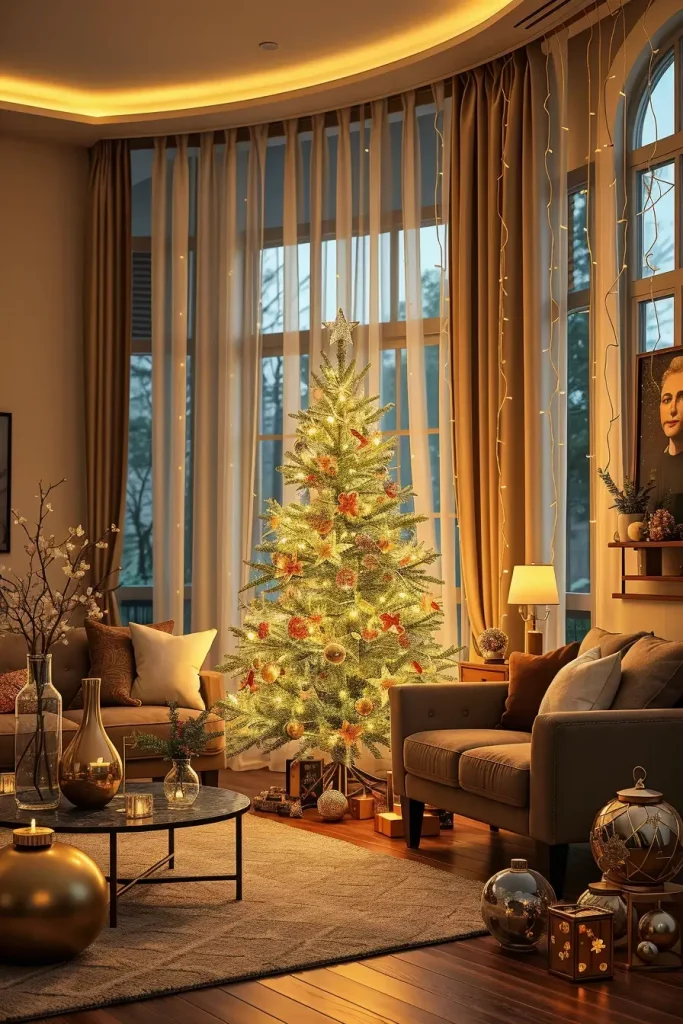 I typically pair a pre-lit gold tree with warm white LED strands and reflective glass ornaments. The ambient light creates an inviting, modern yet magical feel, perfect for evening gatherings.