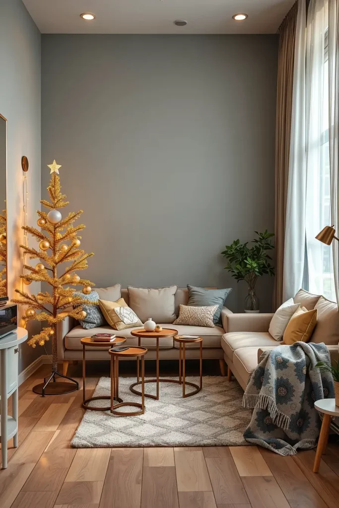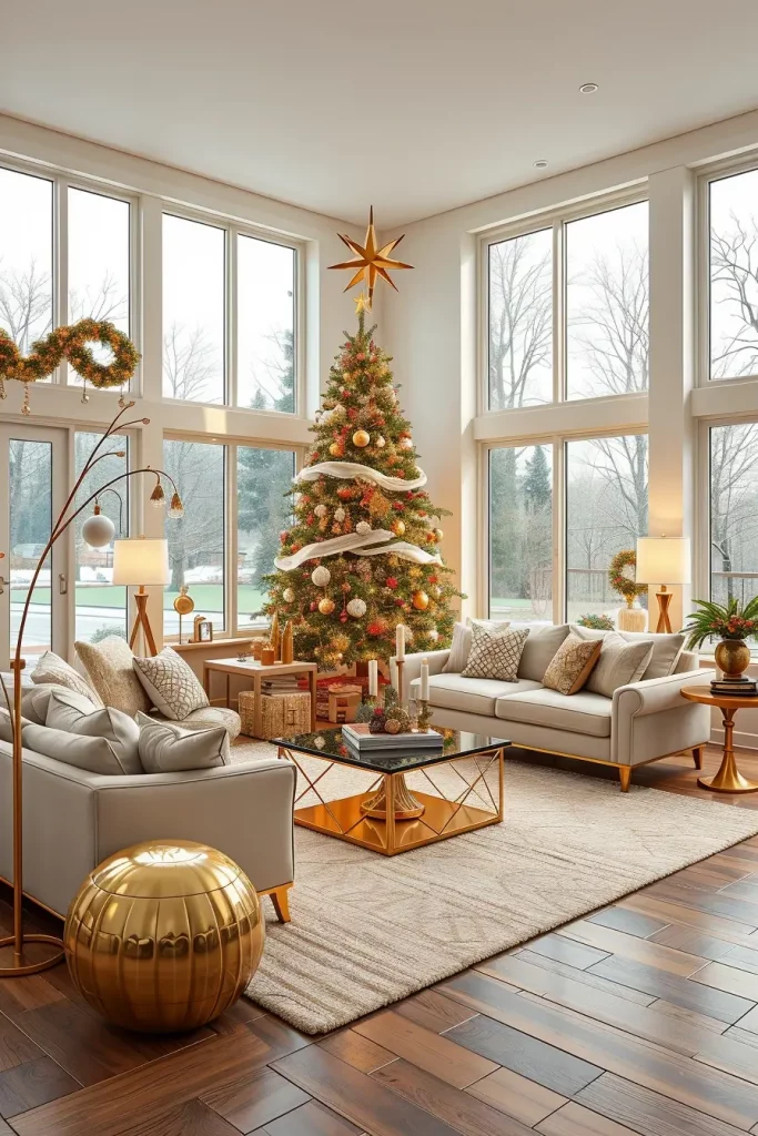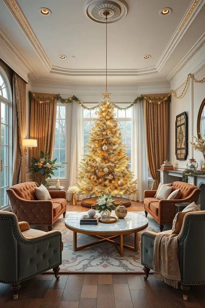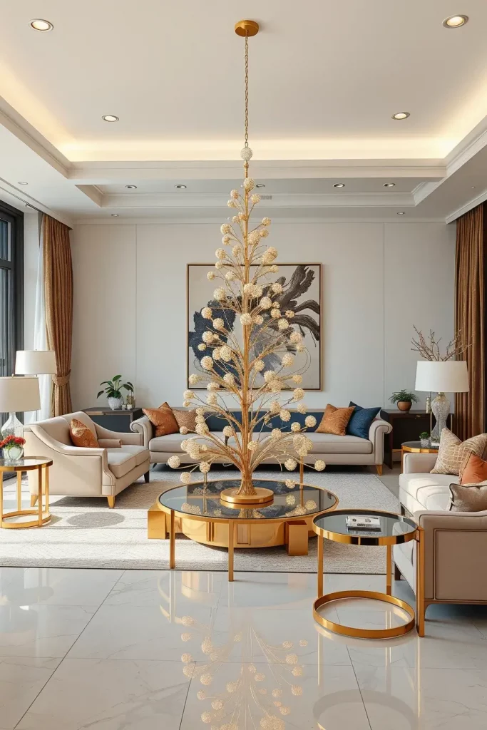 I always make a special corner when the Christmas tree is designed around a gold tree, which looks purposeful and designed. The tree must be framed with a designer and modern corner and be filled with complimentary decor: a statement chair, a nice floor lamp, and perhaps a console table with candles or ornaments. This arrangement causes the tree to look like it is part of the room, but not a seasonal object.
