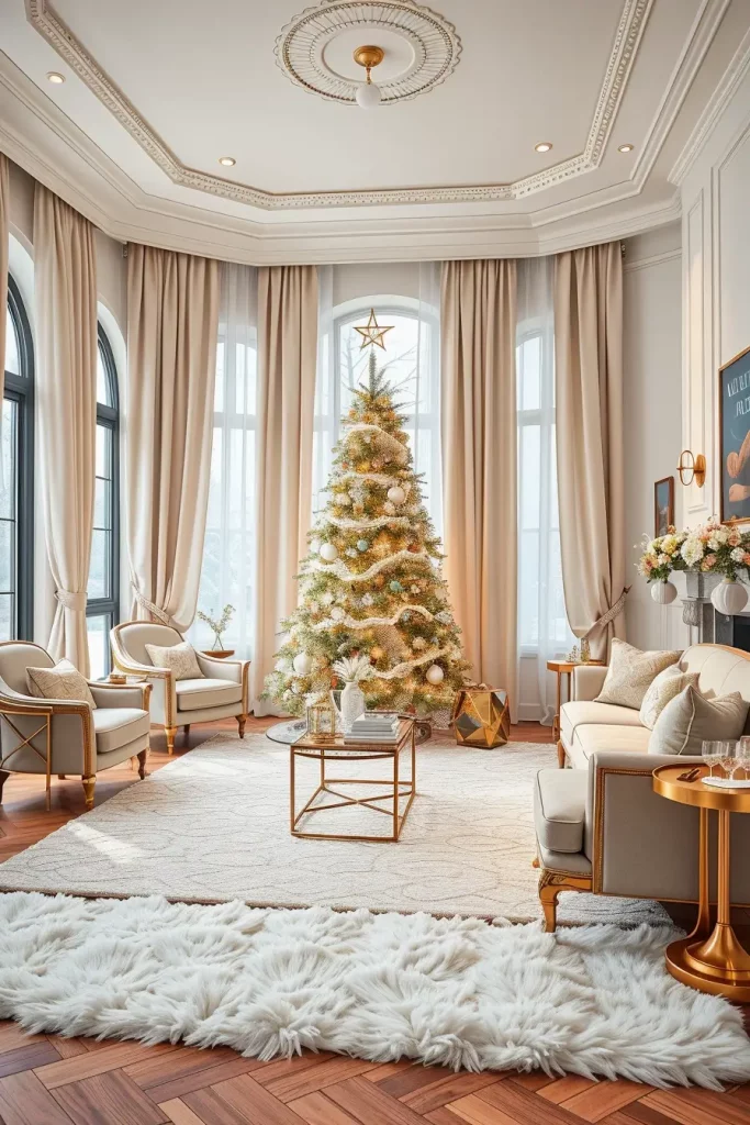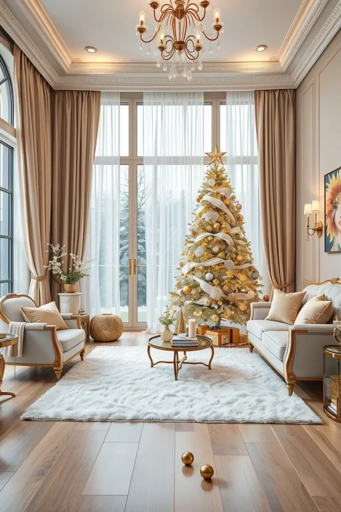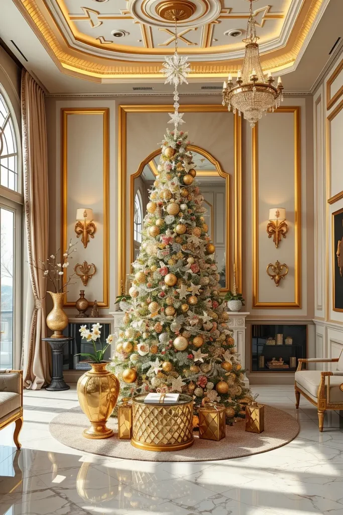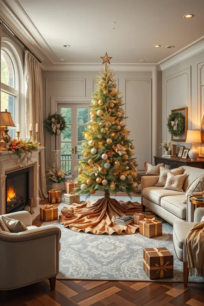 In order to dial this part, I could recommend incorporating a couple of cozy gold faux fur throws or a mirrored tree skirt at the bottom. These last details enrich the general composition and make it more harmonious, to unite comfort and extravagance.