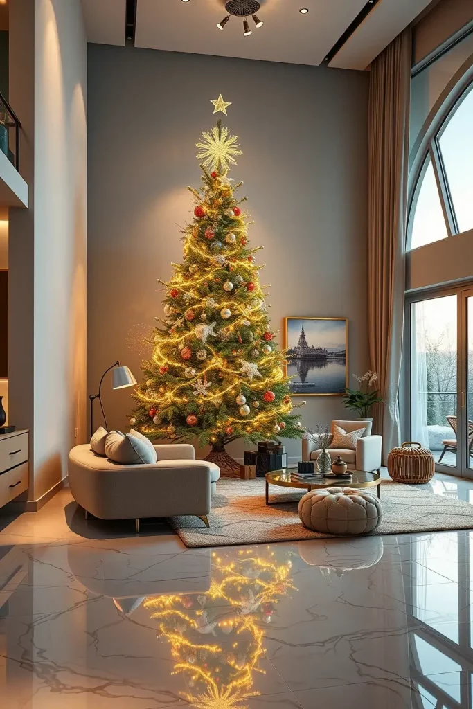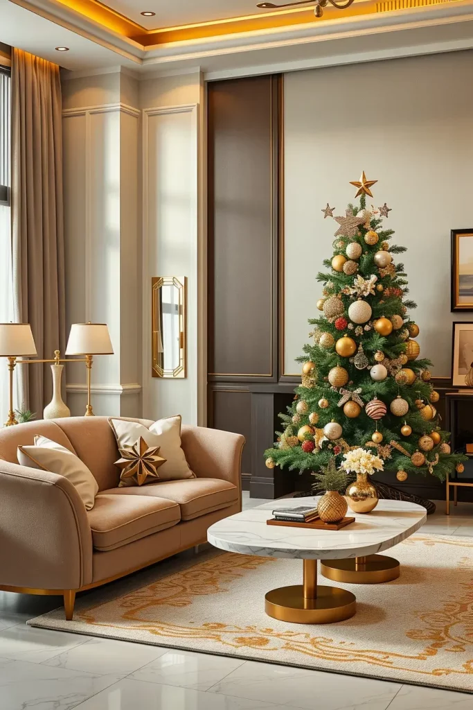 I combine the tree with modern pieces of furniture: smooth marble table cups, curvy beige couches, and gold flooring lamps. The outcome is that there was a unified design narrative in which the tree does not appear as a supplement to the decor. The lighting on the ceiling is done with accent to increase the reflectivity of the ornaments of gold.