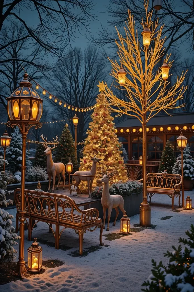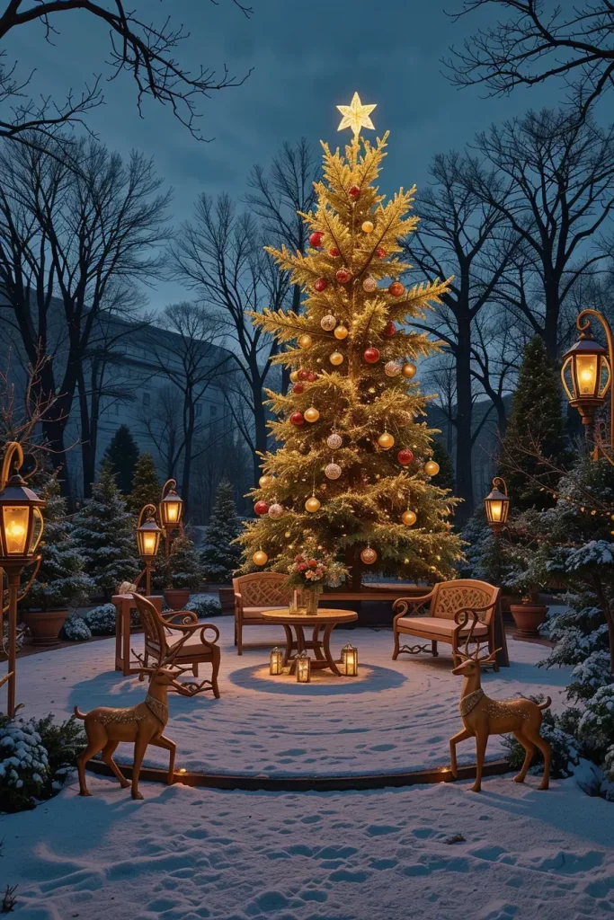 The role of outdoor furniture is also considered – consider gold-framed benches, neutral cushions and reflective planters. These details help to form a visual narrative between the nature and glamour. The glittering tree is a fantastic center of focus through the window despite the view taken when one is inside a house.