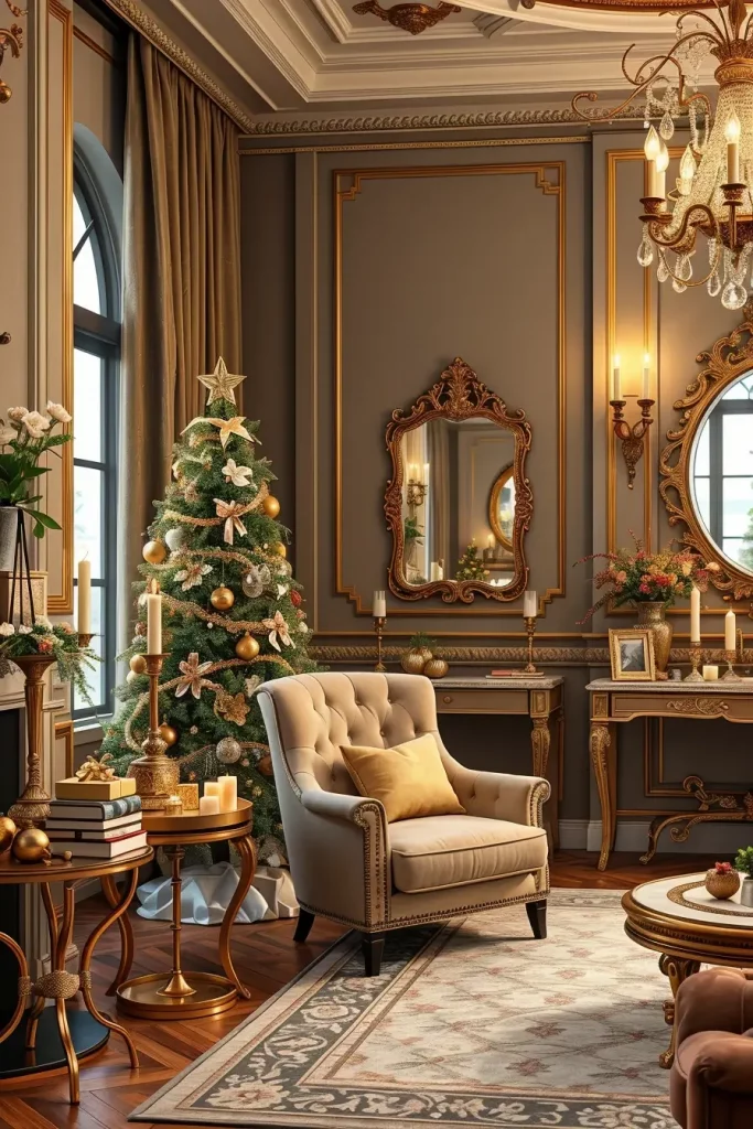 In the case of furniture, I choose something that will match with the golden color of the tree. The festive atmosphere is enhanced by a cream or beige velvet armchair, a side table with gold accents and mirrored surfaces. An abstract art or a huge framed mirror over the console table will help in increasing the visual balance without overlooking the look of the table.