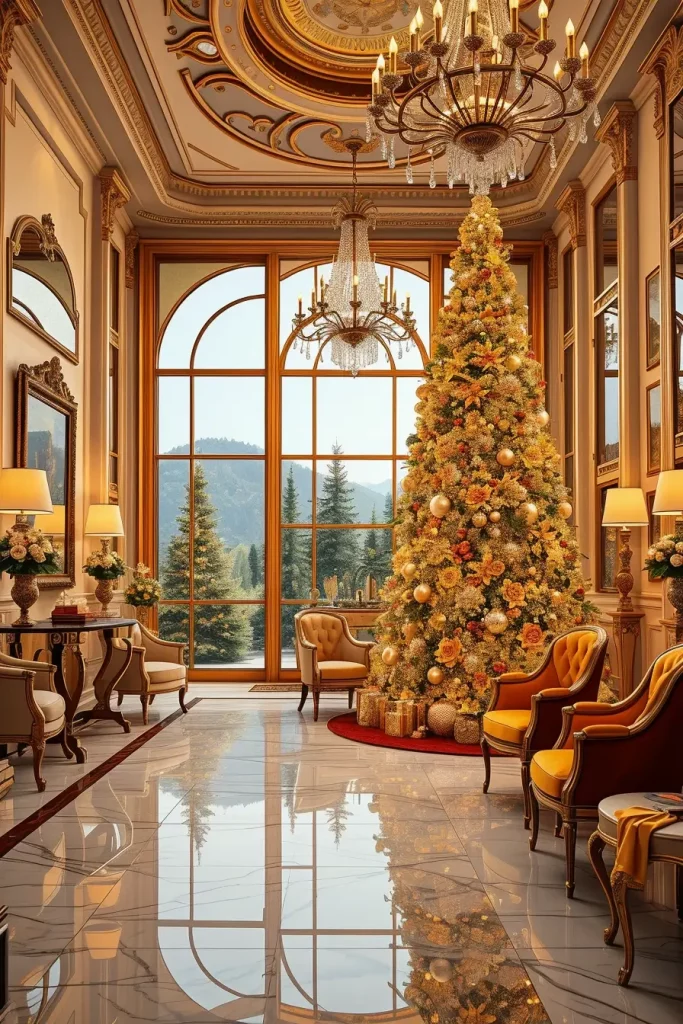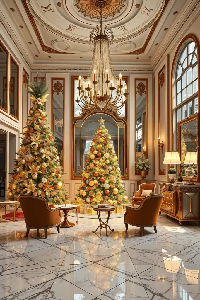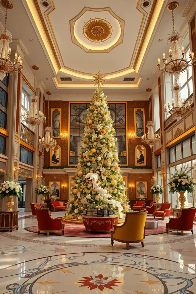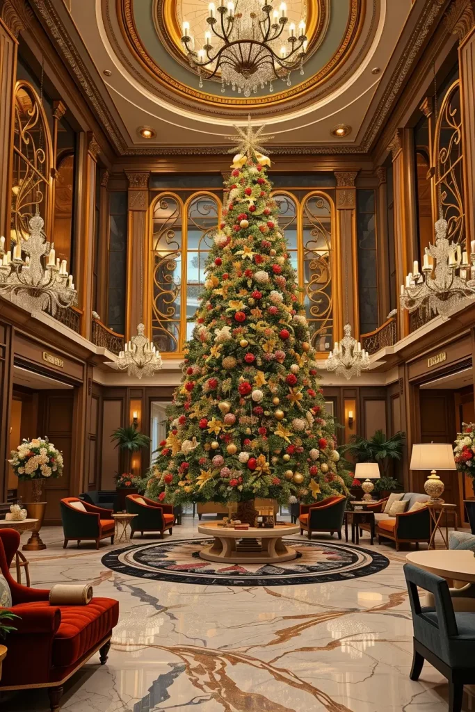 I create layers of textures in such spaces metallic ribbans, glass and crystal garlands. This richness must be reflected on the surrounding furnishings: velvet chairs, marble coffee tables, and chandeliers that have gold decorations. The tree should be located in places with a lot of sight like a grand stair and places with atriums.