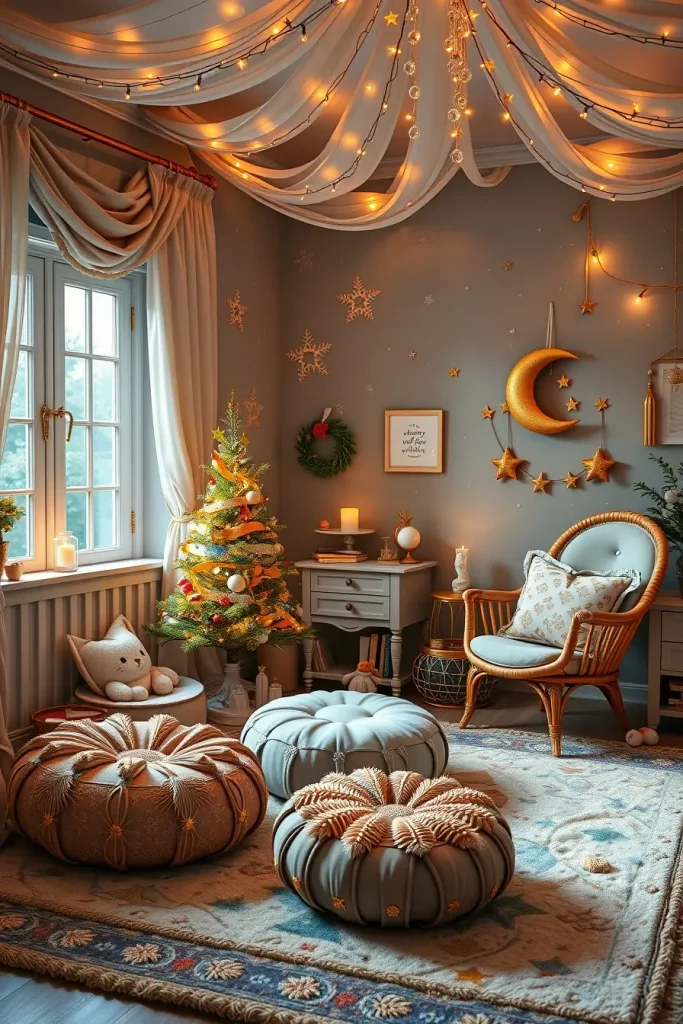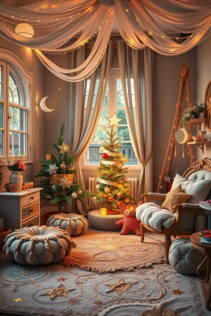 I’d enhance this section further with delicate sheer curtains that diffuse light, allowing the fairy-tale shimmer to spread naturally through the room.
