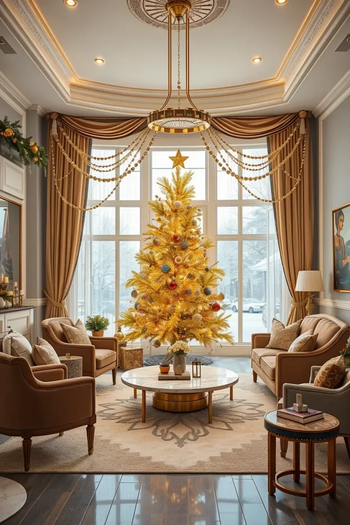I have observed that there has been an increasing tendency by designers to use bizarre textures to render gold Christmas trees more expressive and touchable. Feathered or metallic finish may entirely alter the way the tree receives the light and provide a soft shimmer or mirror effect to the room. When interioring such textures, I would tend to combine this with velvet armchairs, champagne colored drapery and marble coffee tables. This makes the gold reflective and at the same time endows the entire space with a sense of modern, designer and exclusive atmosphere which makes one feel thankfully elevated.