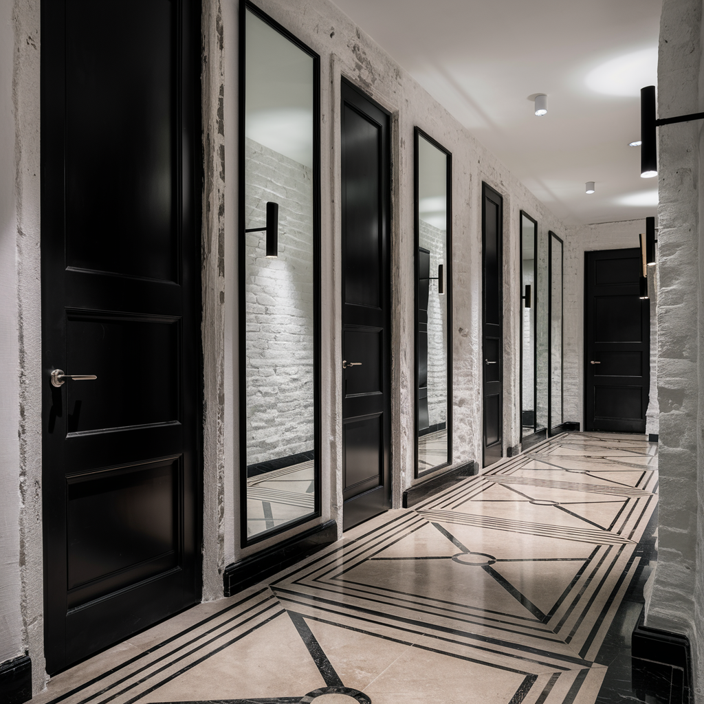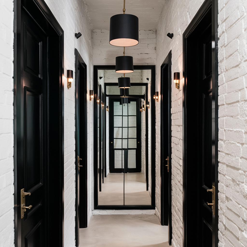 Bold black doors can effortlessly create an aesthetic that is fresh and unique in a narrow hallway. Paint the walls of the hallways in a light color so the contrast of the black doors becomes the standout feature. Use the dressing of the space with items like a black-bordered mirror, push-button light fixtures to depict a matching picture.