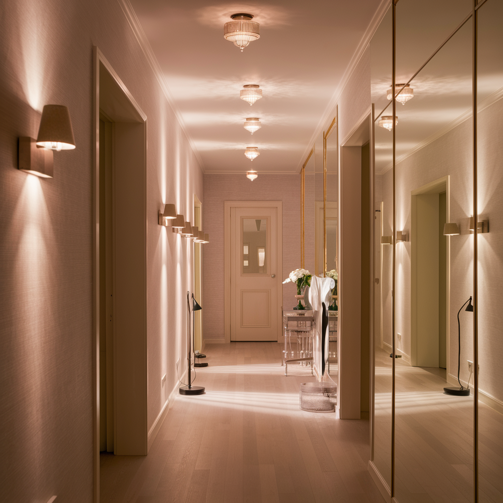 Designing narrow hallways with low natural light conditions is not about choosing the brightest light but requires the smart play of light and color. In this narrow space, ceramics that have the properties to reflect light on the walls and ceiling can serve the purpose well. Bring in different light sources, e.g. wall sconces, floor lamps, and ceiling lights in order to bring out shadows and not just one spot being lit. Alternatively, mirrors and glass can be employed as reflecting elements to make the room look more spacious.