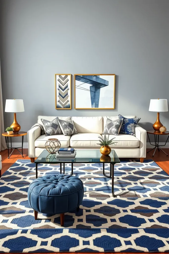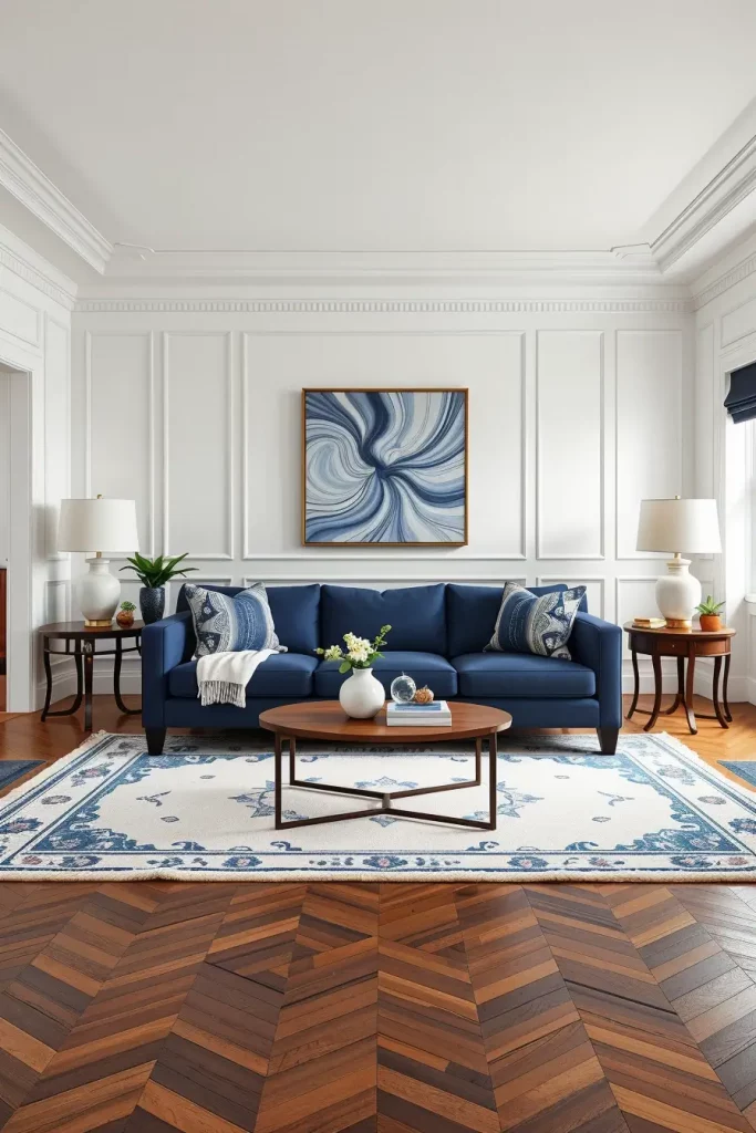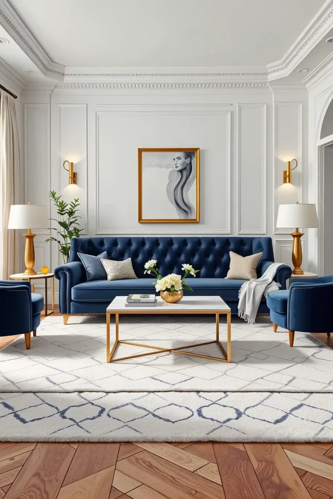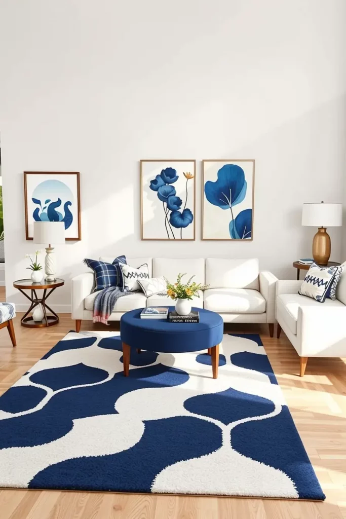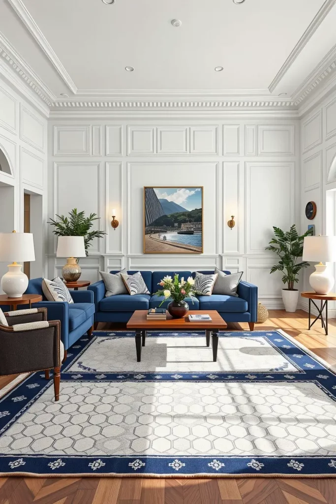 Geometric rugs are a fantastic way to reinforce a navy and white color scheme in a living room while giving the floor a sense of purpose. The approach works best for clients who require space division or need to establish organizational elements within relaxed areas. This design solution creates an enormous visual effect that does not intrude on the space.