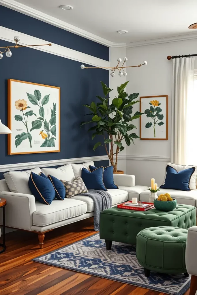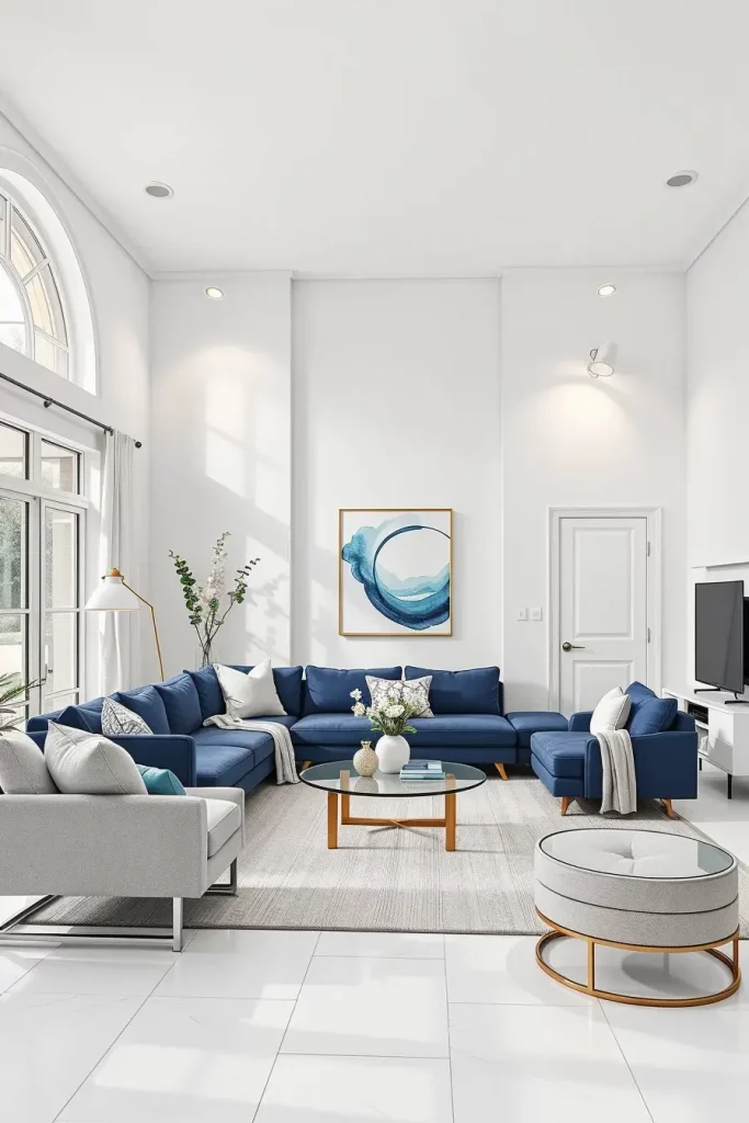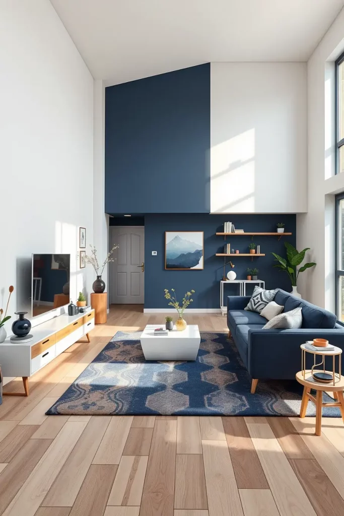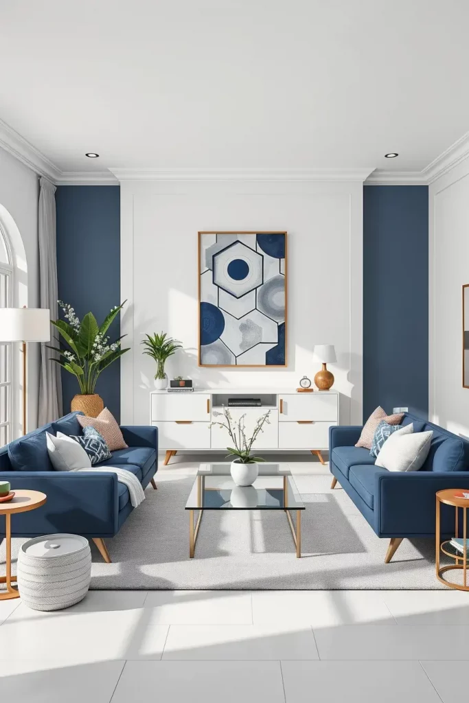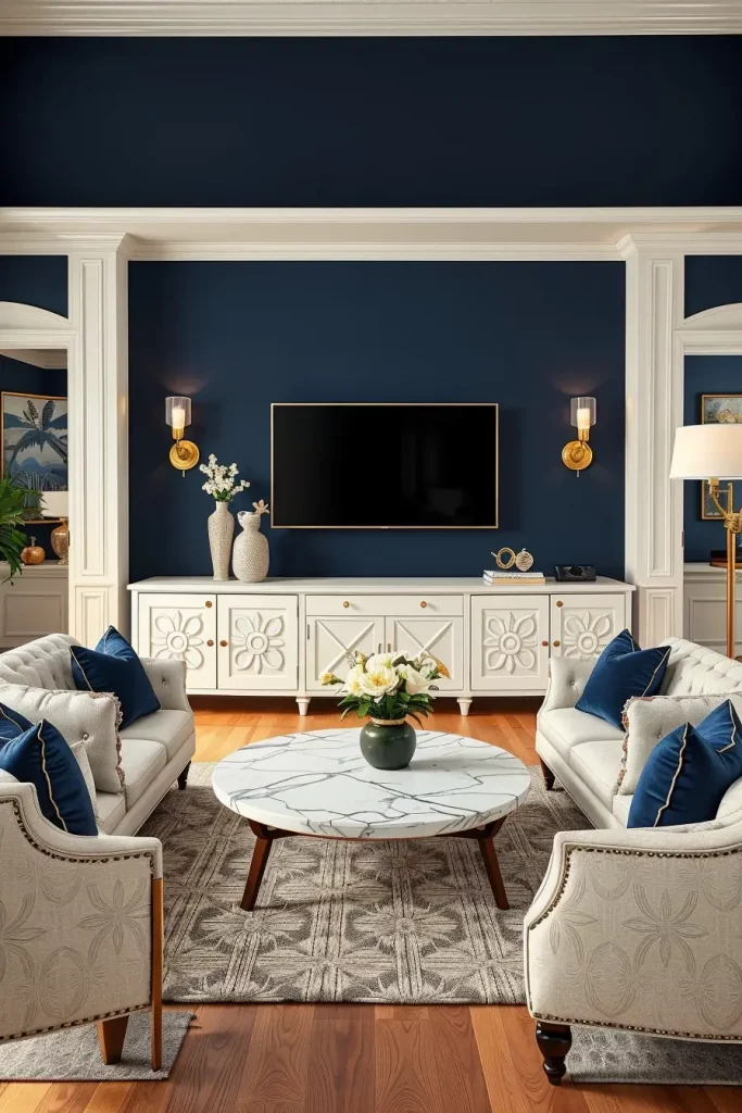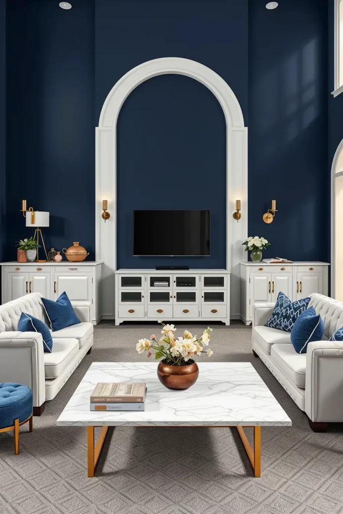 I choose a powerful navy wall behind the sofa area or fireplace before applying matte or satin paint finishes to it. The white sofa I choose has either gentle curves or tufting elements that create visual softness. A media console with white lacquer finish paired with pale wood or marble coffee table and navy throw pillows establishes equilibrium in the room. Brass wall sconces that hang from vertical surfaces or minimalist black lights enhance the visual interest of space height.