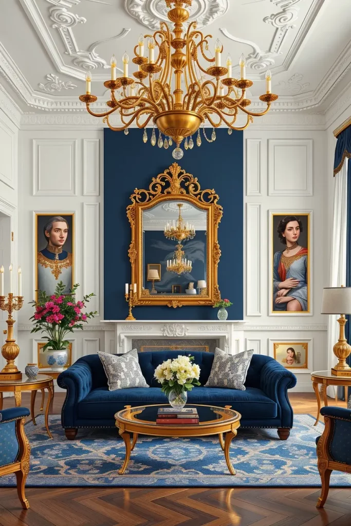 My design process starts by placing navy velvet or linen sofas against either white walls or paneling. Then I layer in gold through light fixtures—like a chandelier or table lamps with brass finishes. A gold-framed mirror when paired with white mantel and gold side tables that flank a navy armchair generates a visually striking appearance. The finishing elements of built-in shelves in my designs include gold-accented picture frames and candlesticks.