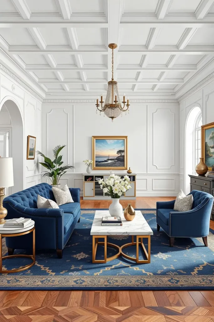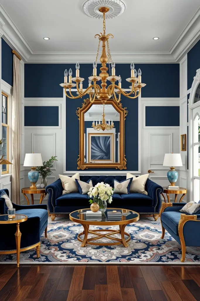 If you’re looking to make a navy and white living room feel upscale and glamorous, I always suggest adding gold metallic accents. Gold complements navy beautifully and elevates white to something more refined. The traditional navy blue with white and gold color combination generates a warm aesthetic effect that pairs well with luxurious materials.